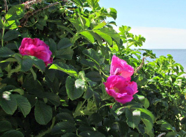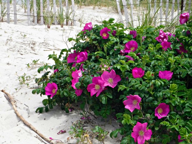 These gorgeous roses, Rosa rugosa, are shown growing on the sand dunes of the Delaware Bay. They endure the ‘pressure’ of the sandy soil and salt water and bloom abundantly in the late Spring. The rose hips they form are huge, and almost as pretty as the flowers that preceded them when they turn golden-orange in the Autumn.