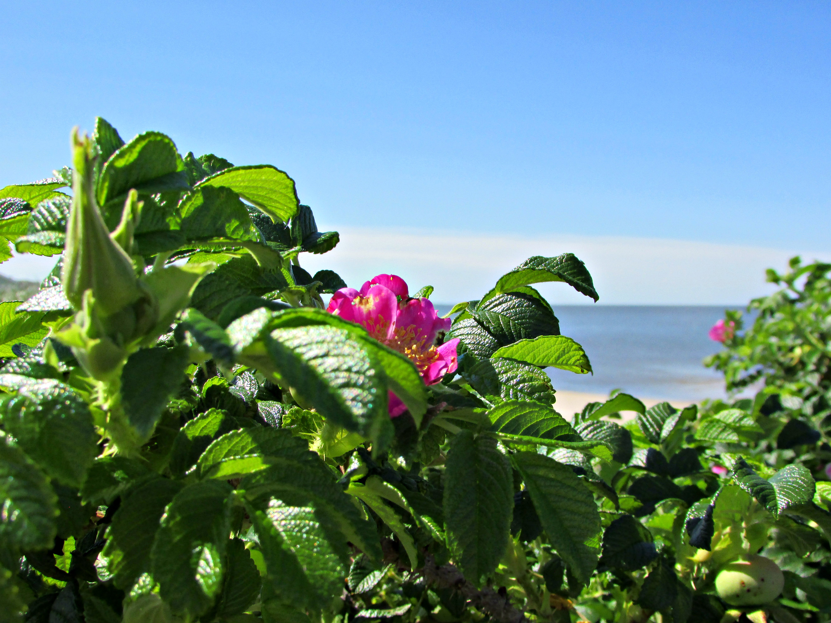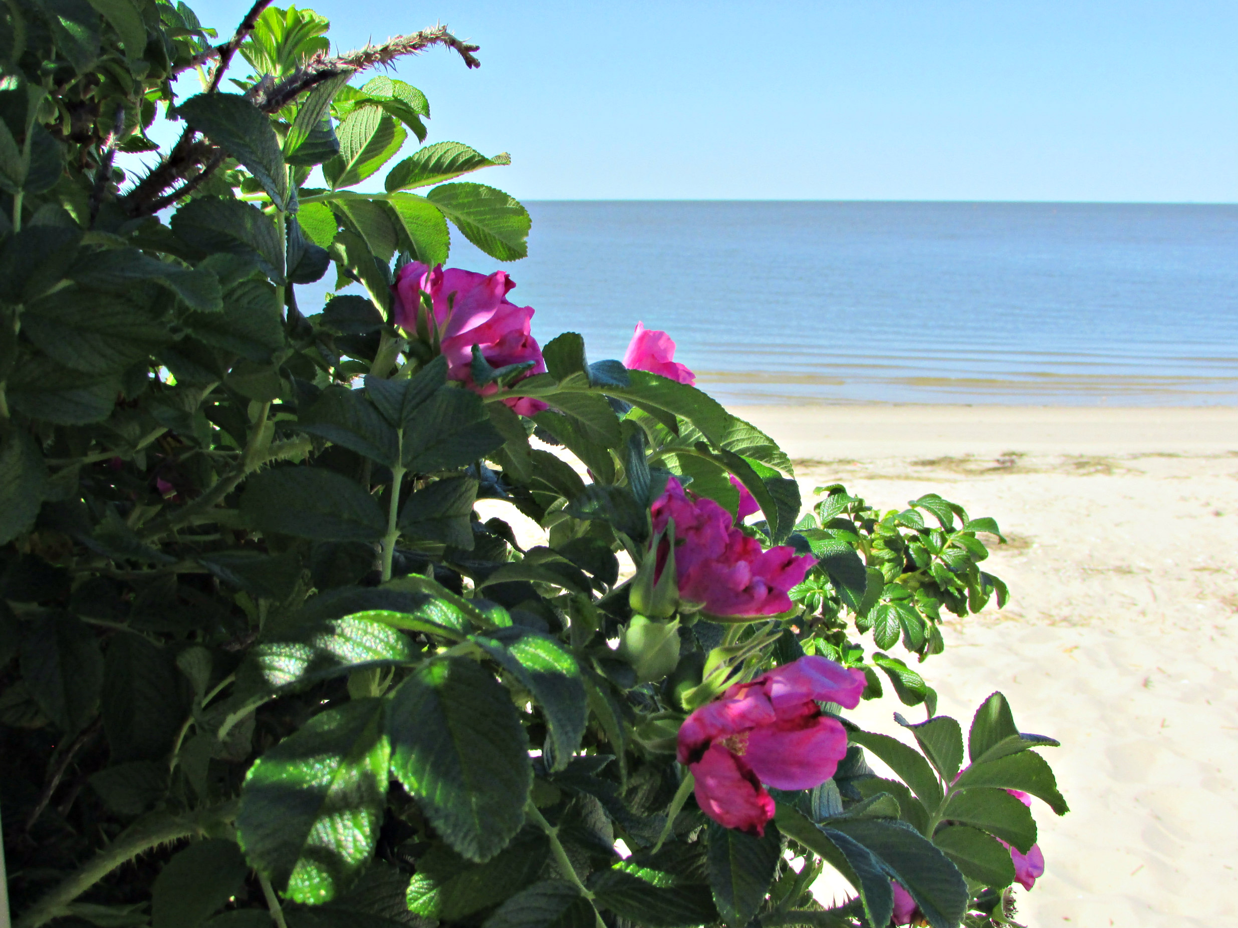 These gorgeous roses, Rosa rugosa, are shown growing on the sand dunes of the Delaware Bay. They endure the ‘pressure’ of the sandy soil and salt water and bloom abundantly in the late Spring. The rose hips they form are huge, and almost as pretty as the flowers that preceded them when they turn golden-orange in the Autumn.
