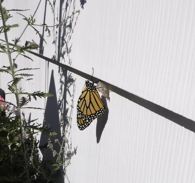 What’s even more interesting is right befere they hatch the chrysalis turns black. I don’t know if you can see the casing of it in the photograph, but it appears to be clear after the butterfly emerges. Thanks so much for stopping by!