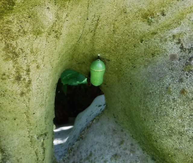 A day or two later I spotted another chrysalis on the underside of a concrete lion statue I have on my patio. I’ll keep a close watch and see if I can witness the miracle as one emerges from the chrysalis.