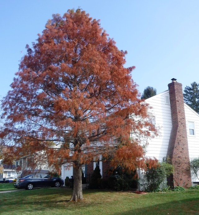 The challenge, November Pick a Topic, included orange, along with other words, vintage, cast iron, etc. Orange is my choice, because it is easily accessible, blazing in the sunlight; my Bald Cypress glows russet orange.