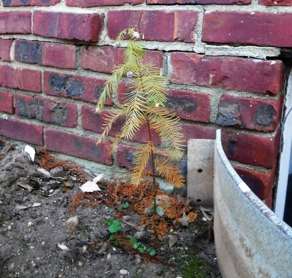 In a corner of my garden a small sprig of a Bald Cypress tree is growing. Planted by way of the wind,or a foraging squirrel, it now stands about a foot. In the Spring, I will have to decide what to do with it. It needs to have plenty of space. In twenty years, it might be on its way to becoming a giant too.