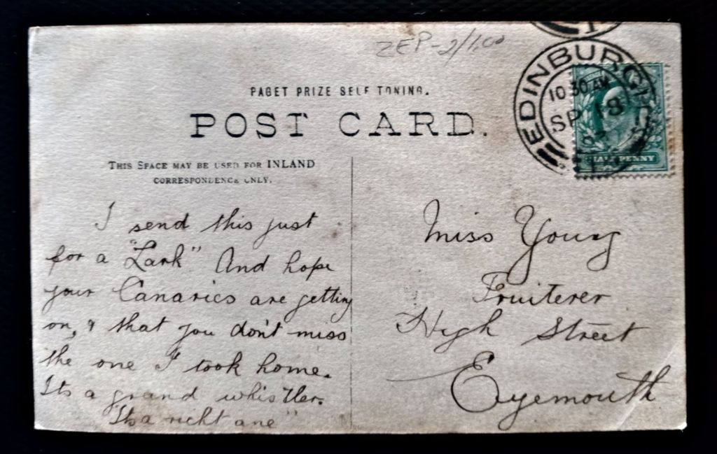 Eyemouth is a beautiful coastal town about fifty miles from Edinburgh. The word ‘Fruiterer’ means just what it sounds like, a seller of fruit. The recipient might have had a grocery shop, or small stand on High Street. ‘It’s a nicht one,’ is Scottish for night.