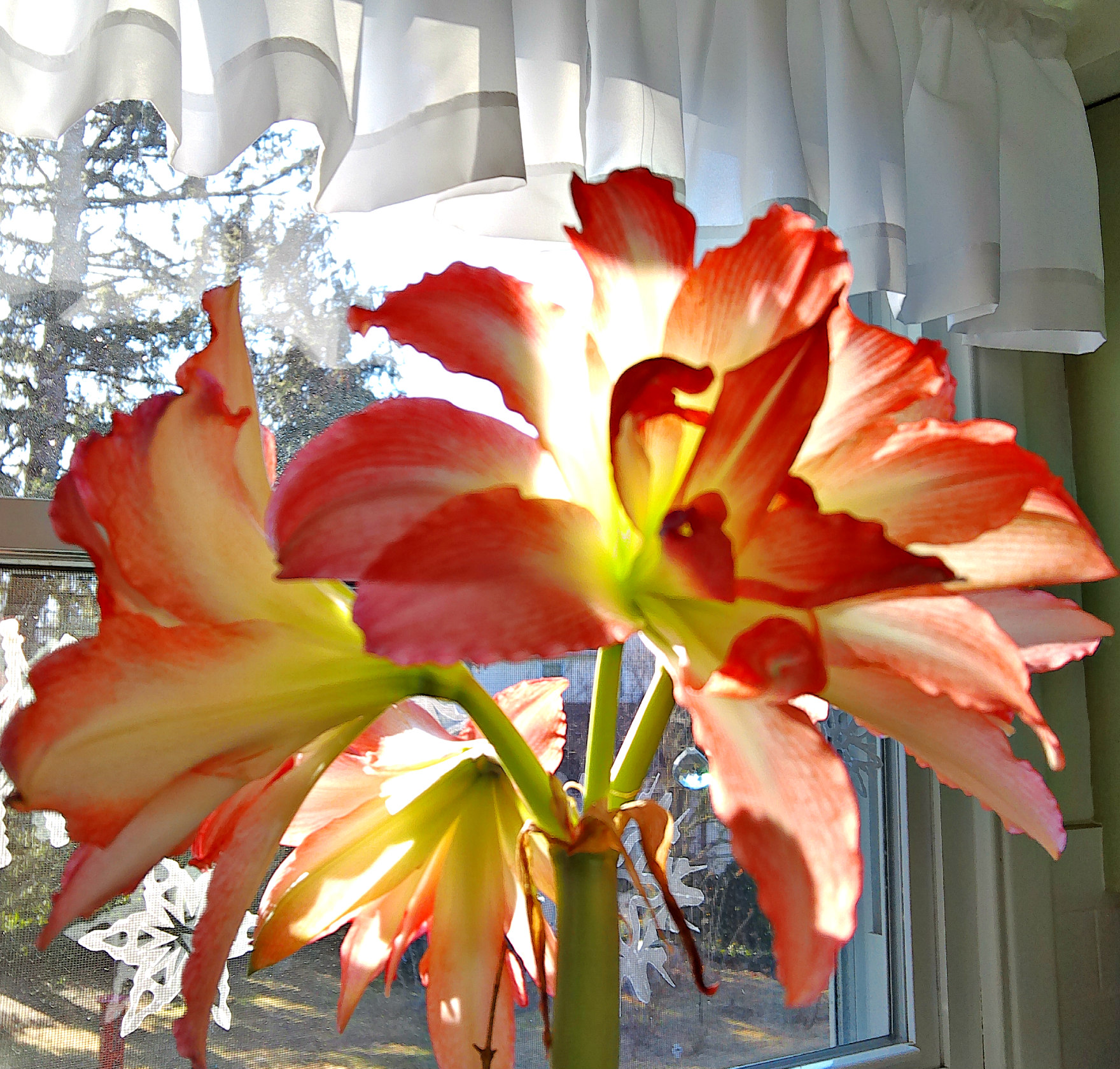 The stem is quite long, 16 1/2 inches from bulb to the top to where the stems begin to bear the flowers. This makes for a spectacular display, but whenever I’ve had an amaryllis so tall, I’ve also had to stake it in some way.