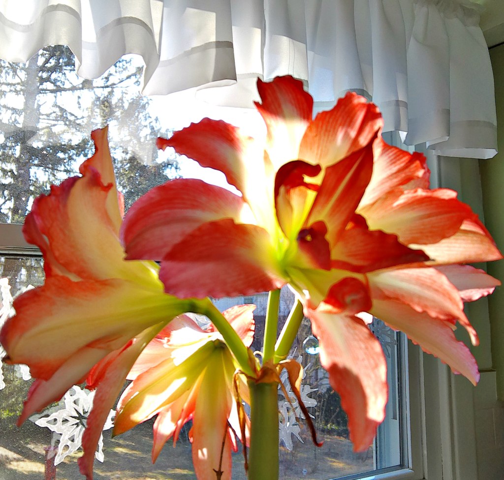 The amaryllis bulb I purchased this year finally bloomed 3 weeks after Christmas; its beauty surpassed my expectations, and it was forgiven. I knew it was going to be of the apple blossom type, white with variegated pink and red lines, but I wasn’t expecting a double bloom. The beauty of the flower is awesome and reminds me to praise the Creator of the heavens and the Earth.