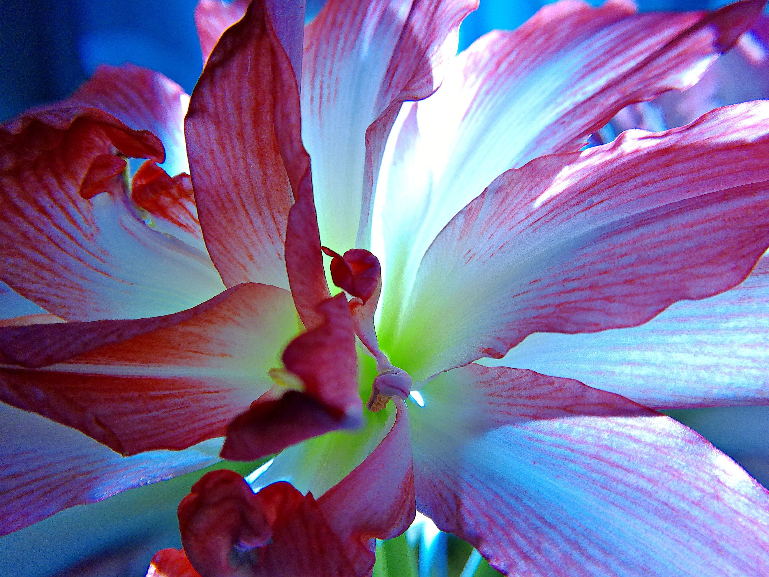 The macro photograph of the blossoming center shows the beautiful melding of the colors and the chartreuse green of the stems. I love the details the camera picks up that the eye sometimes misses when gazing at the flower as a whole.