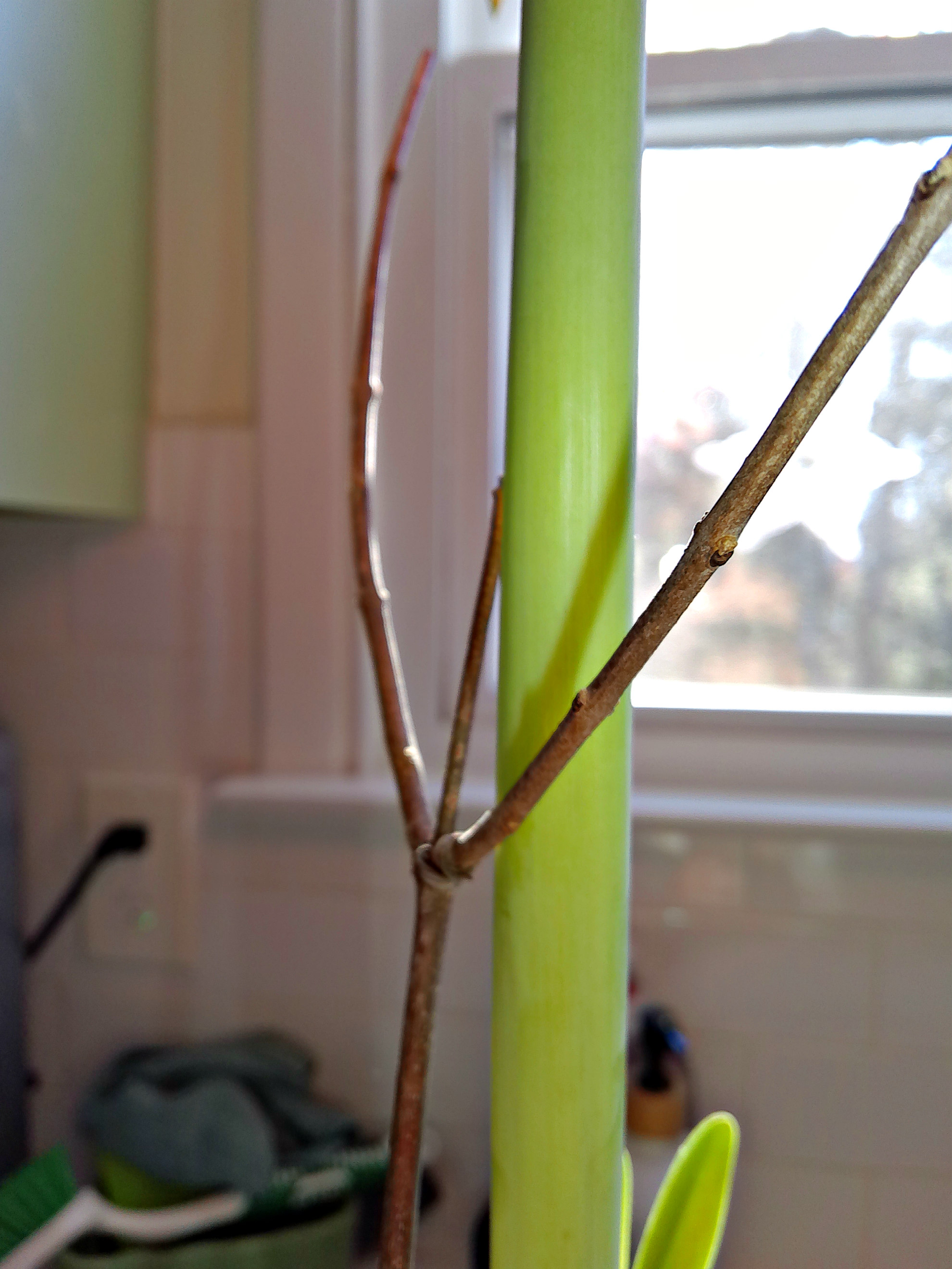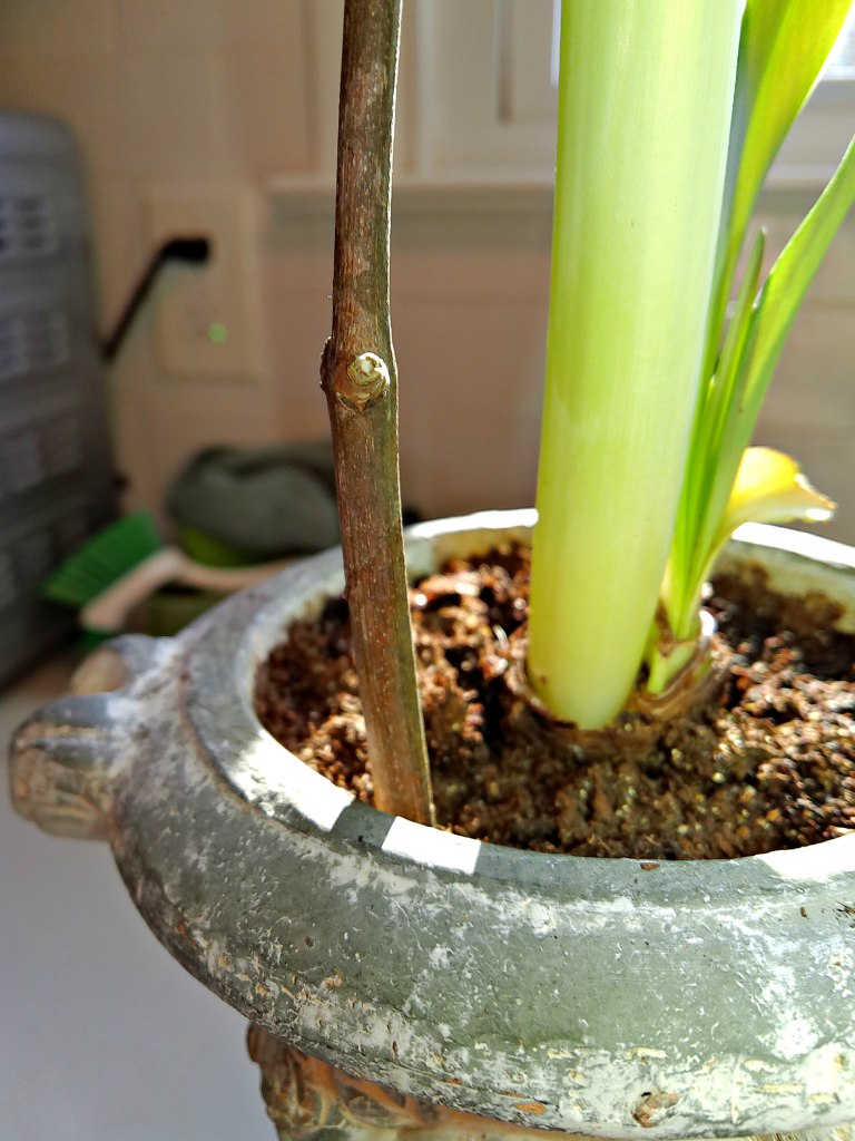 To keep the plant looking natural, I usually clip off a forked Branch from one of my bushes or trees and use that to help it stand upright. I always try to choose one that follows the curve of the pot so it won’t pierce the bulb and let bacteria get into it.