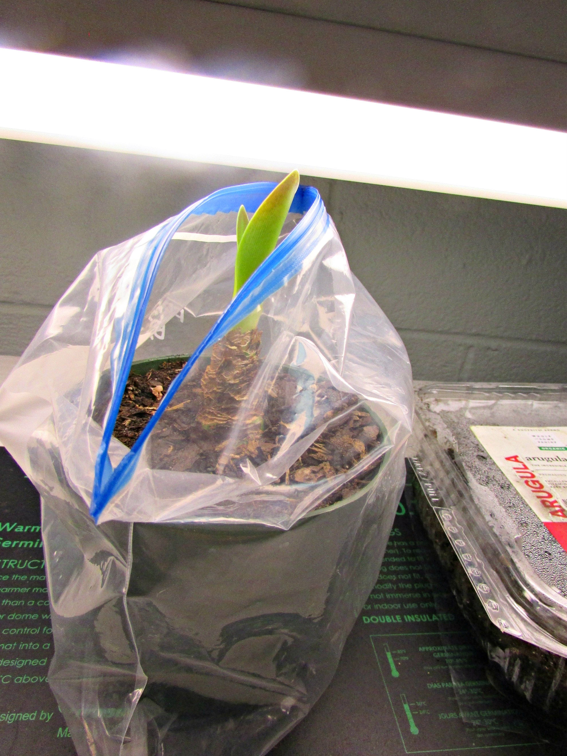 I also saved an amaryllis bulb from last Christmas. I did everything required. I let the long, strappy leaves grow all summer outdoors on the porch. Sometime in September or October, I stopped watering and then cut away the yellowing and brown leaves. I could see that the top of the bulb was green, but it displayed no shoots reemerging from the top. A week or so ago, I decided to give it a bit of a nudge to get it blooming. I took it out of the cold window I’d been storing it in and placed it in a Ziploc bag on top of a heating mat. Voila, within a few days, I saw a rounded tip of a leaf at the top, and sure enough, true to its nature, the leaves started growing at a galloping rate. I am hoping it will send up a flower stalk in the next few weeks. Updates will follow.