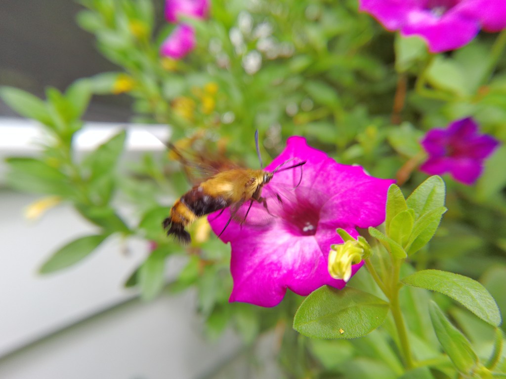 The visitor is one of my favorite insects. We see them very sporadically, and never in numbers. This makes them exciting, and when they are spotted, my husband and I will immediately call to the other, ‘A hummingbird moth is on such and such a plant.’
