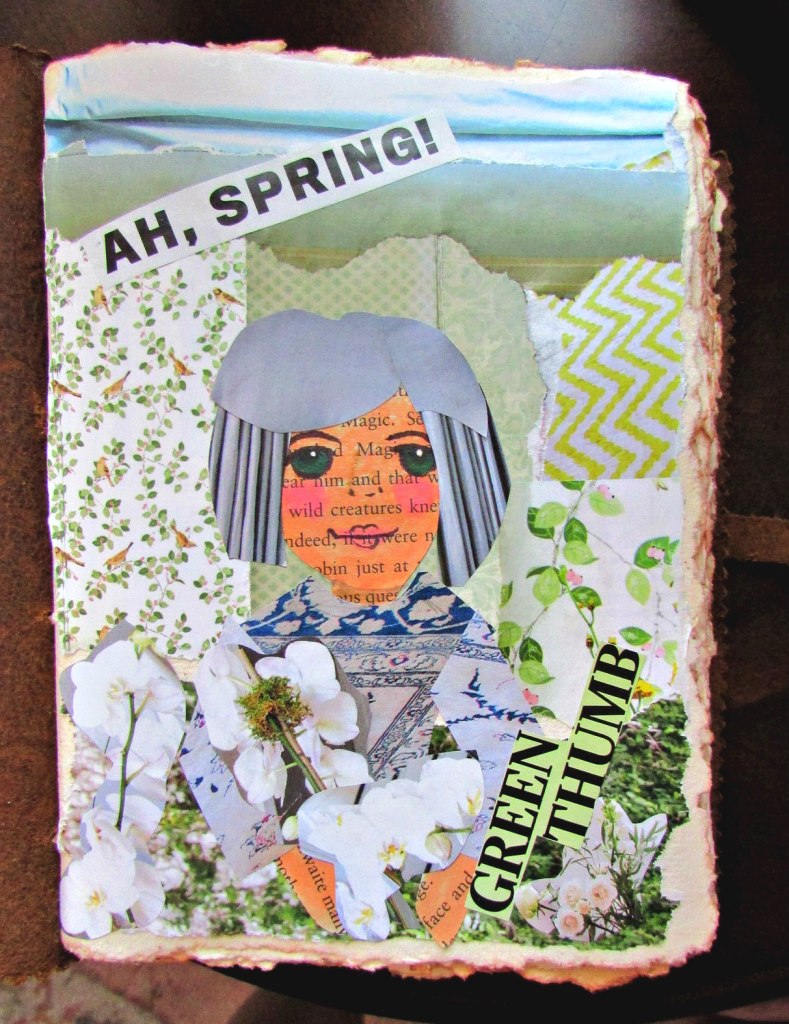 I have many magazines and found them to be a good start for collage journaling. I have stopped coloring my hair, and the grey is a good representation of my new look. I found this project a good fit for a relaxed Sunday afternoon, and I hope to continue throughout the year.