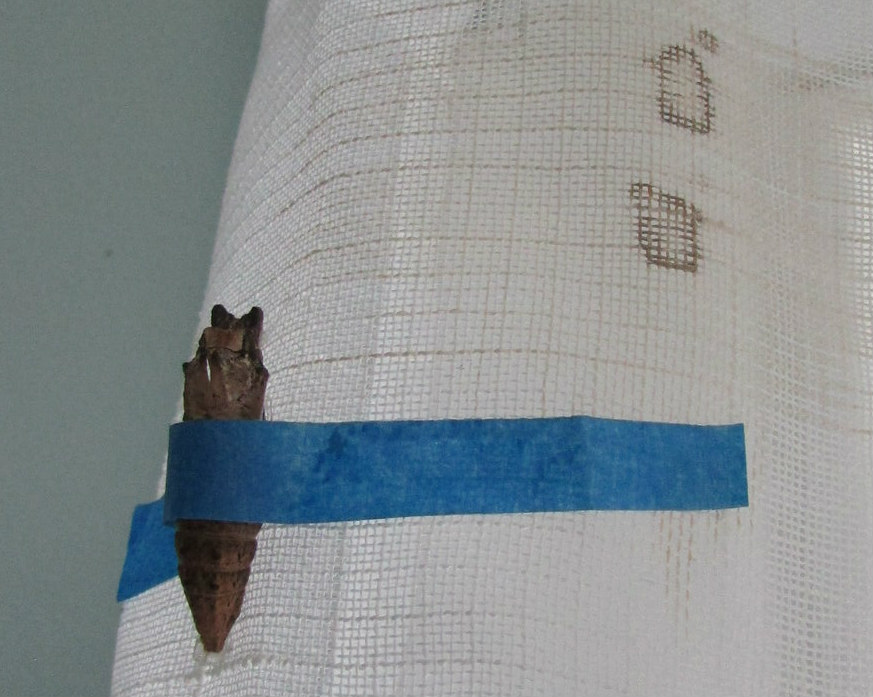 Several butterflies overwintered on the porch until a hungry wren ate every chrysalis that was not partially held in place by blue tape. I saved four, and three are resting on my curtains; maybe they will surprise me soon.