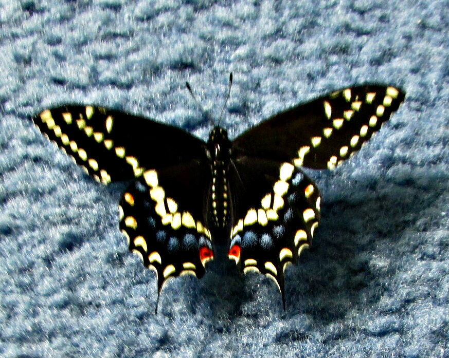 The photo is a bit blurry, but you can see the beautiful creature resting on my carpet. Thankfully, the day temperatures were very warm, and there were blooming flowers. I was glad the butterfly could be released immediately. I hope it found some shelter, sustenance, and maybe a friend.