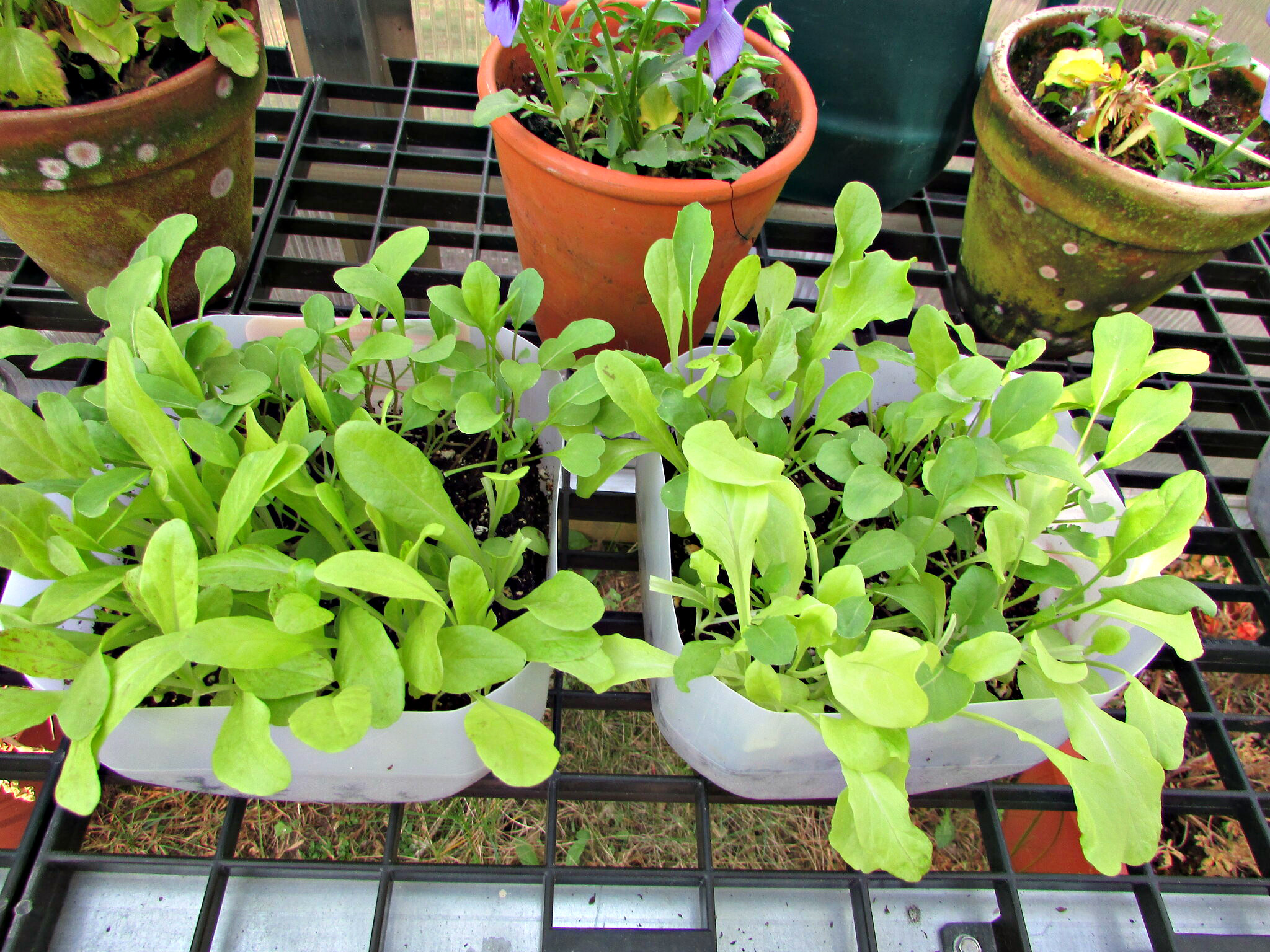 Winter-sown lettuces and greens have reached a point where they are irresistible to grazing. Oh, the joy of fresh greens. I cut the tops off the milk cartons after sprouting and use the bottoms as pots.