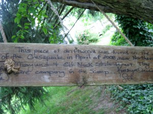 “This piece of driftwood was found on the banks of the Chesapeake in April of 2008, near Northeast, Maryland & Elk Neck State Forest. They (Kathy & Joe) were camping in the Scamp.”