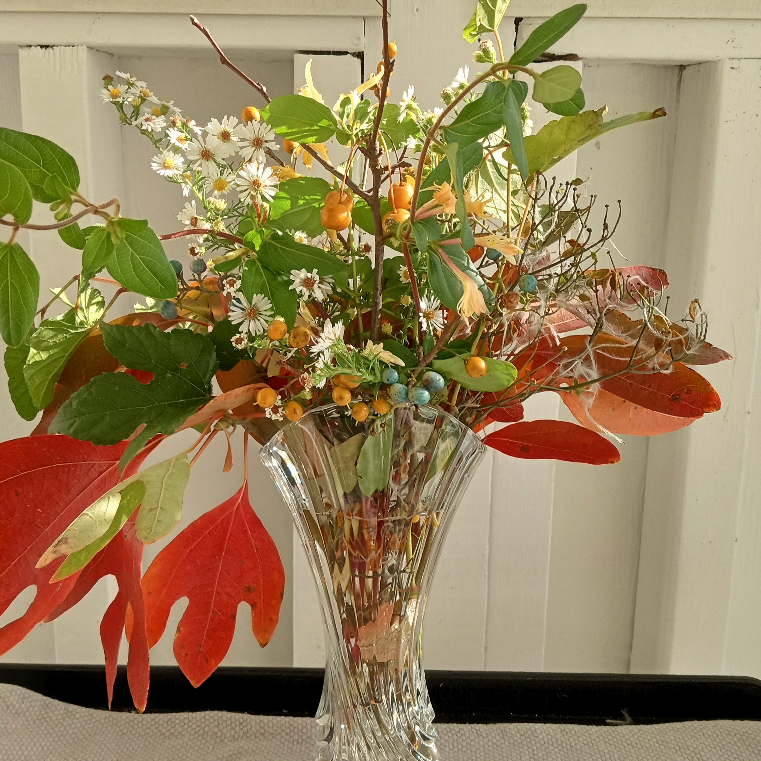The plants used in today’s IAVOM are: honeysuckle, bittersweet berries, porcelain berries, crabapple, frost aster, autumn clematis seedpods and sassafras leaves.