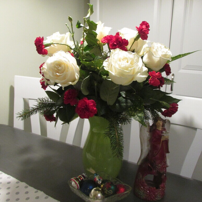 The red mini-carnations are over a week old and still blooming nicely. They have a mild cinnamon fragrance. The white roses were a lucky find, purchased in the supermarket; it is rare to find roses with such a high petal count and without browning for under $10.00.