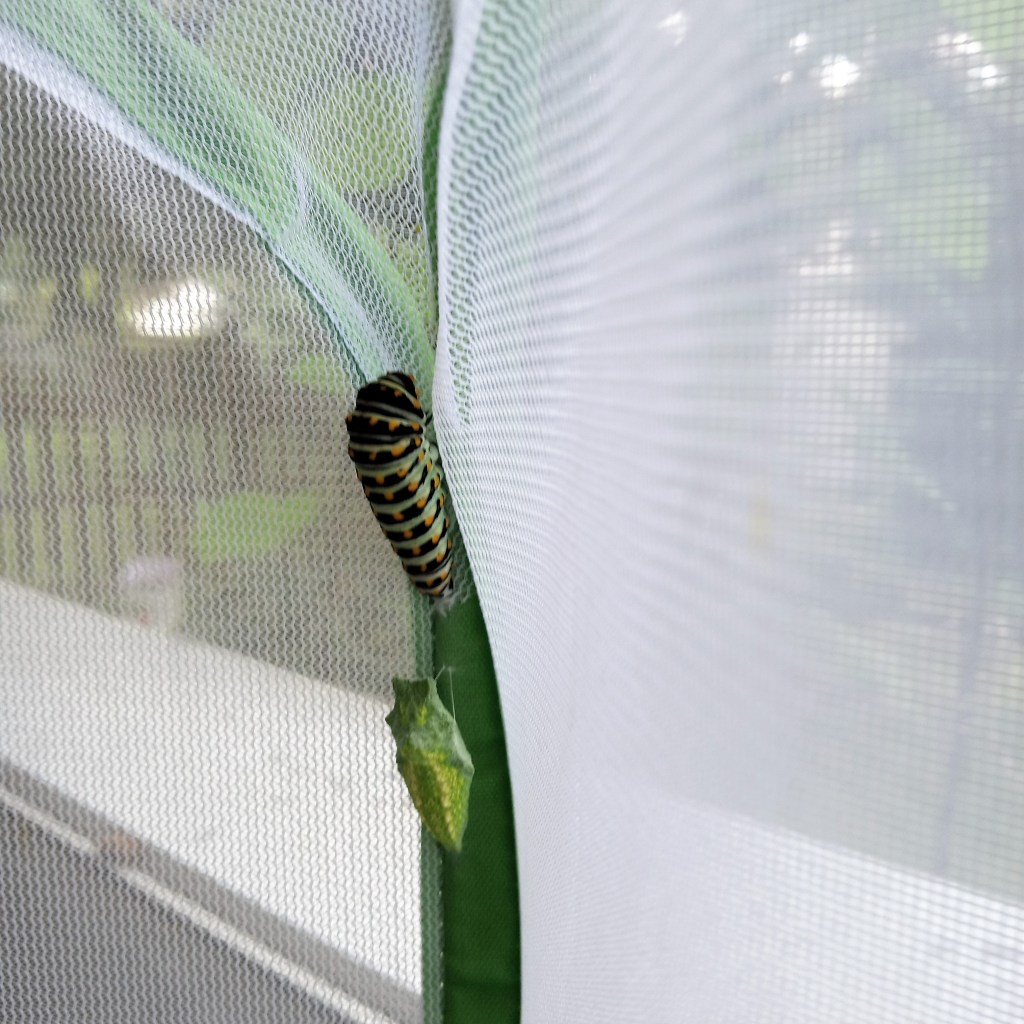 Vacation time arrived, I knew several mature caterpillars would be ready to drop and form their chrysalis, and most likely would emerge while we were gone. Not wanting them to starve on the screened in porch, or be eaten before they had a chance to develop if I set them free outdoors, I crafted an enclosure out of a tomato cage. I used wide crafting mesh I had left over from Halloween, and a few clothespins. It was easy to do, and I expected to find all the caterpillars forming chrysalis on the mesh. I was surprised when most chose the steel of the tomato cage instead. After metamorphosis had begun I removed the mesh and placed the cage outdoors.