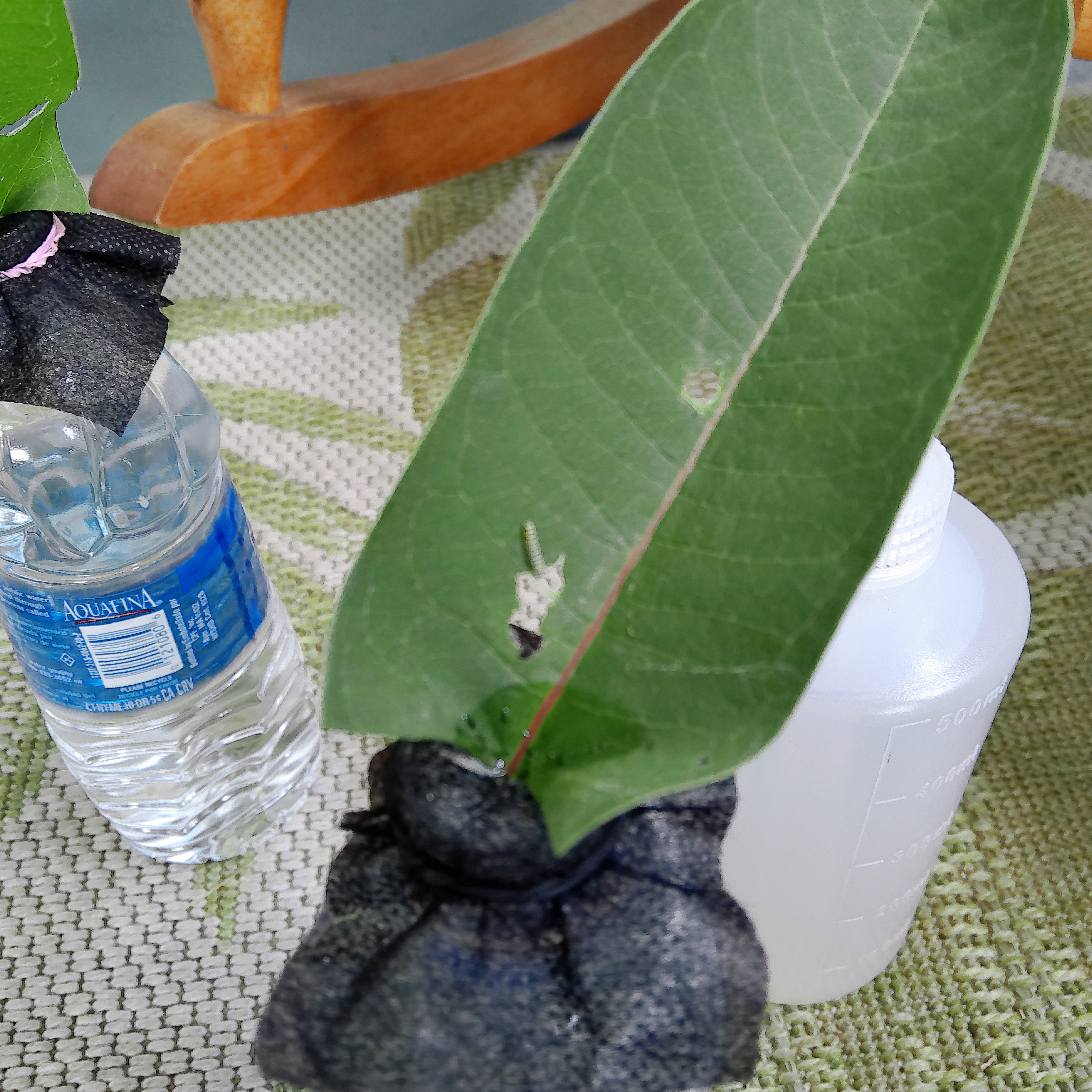Because I’ve experienced the dilemma of monarch caterpilla cannibalism, I needed to find a better way to raise them this year. I brought one of the monarch caterpillars in on its leaf and using an old water bottle, garden cloth, and a rubber band I created a standalone leaf holder for the small caterpillar. Besides working at keeping the caterpillar separated, the bottle added a benefit; the leaves have stayed pliable and fresh for days.