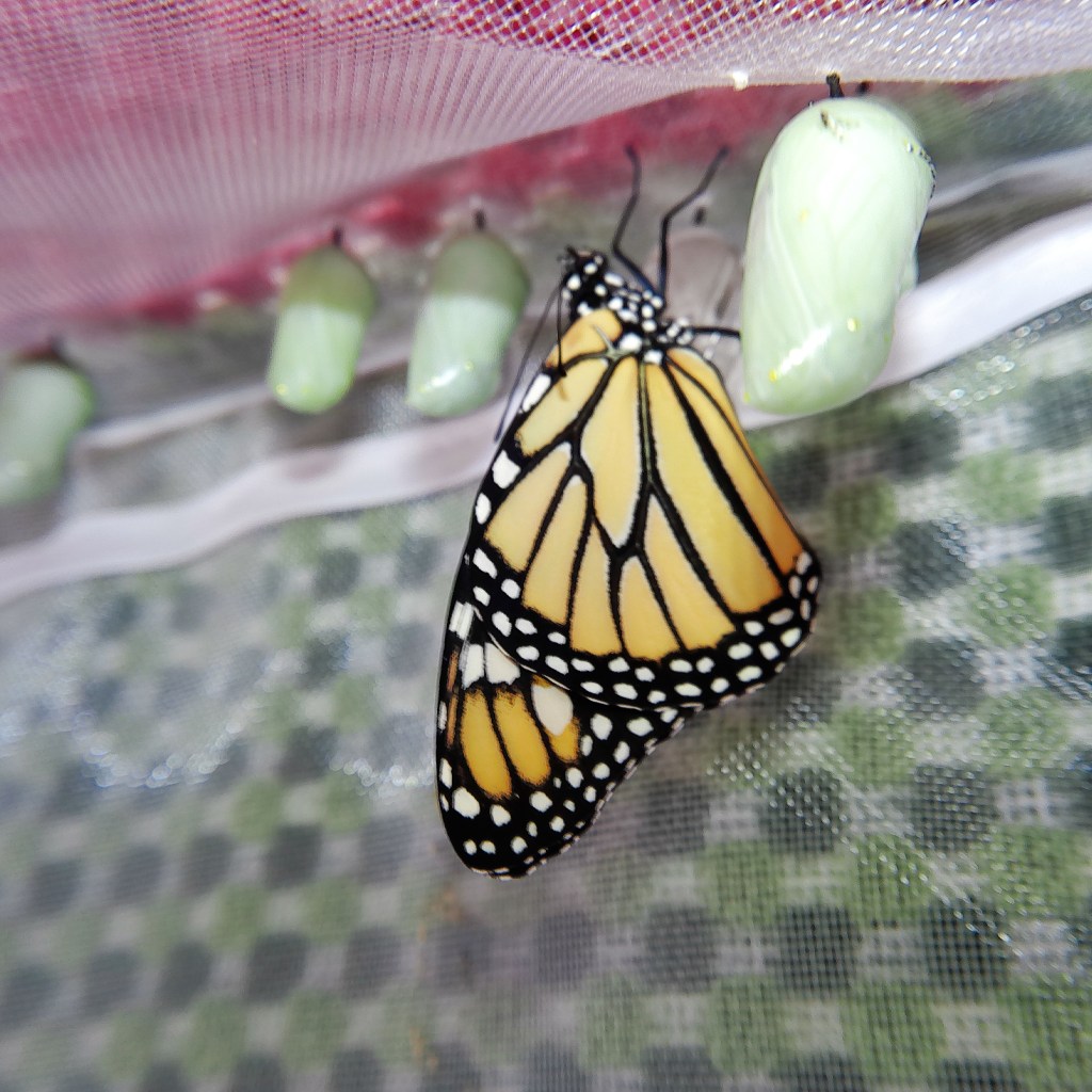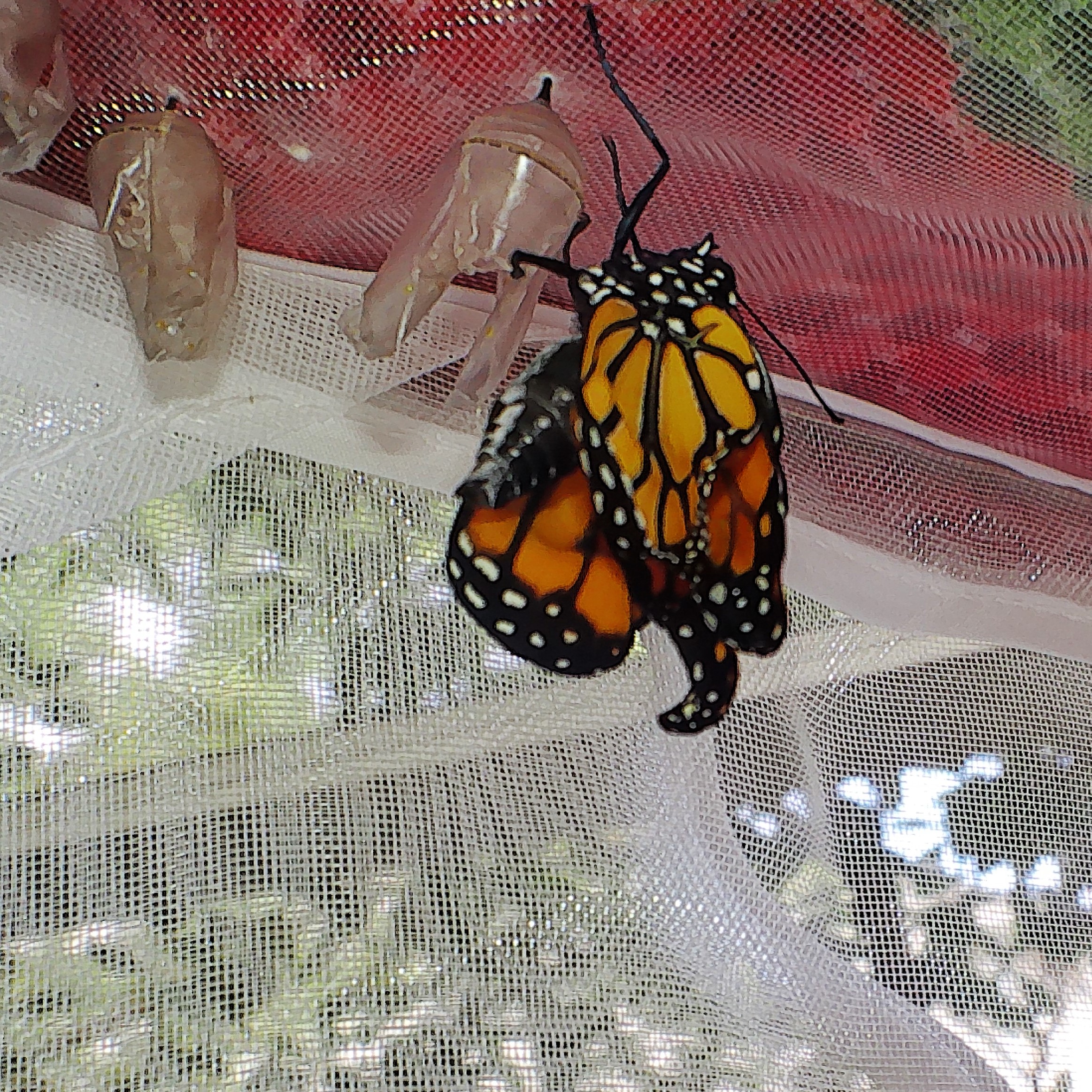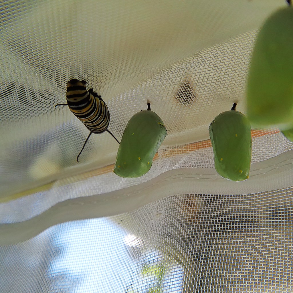 Photographed today, Monarch Butterflies in different stages of development. The one who eclosed today is ready to begin its adventure of flying to Mexico for overwintering. Later in the morning, the one on the left also emerged.