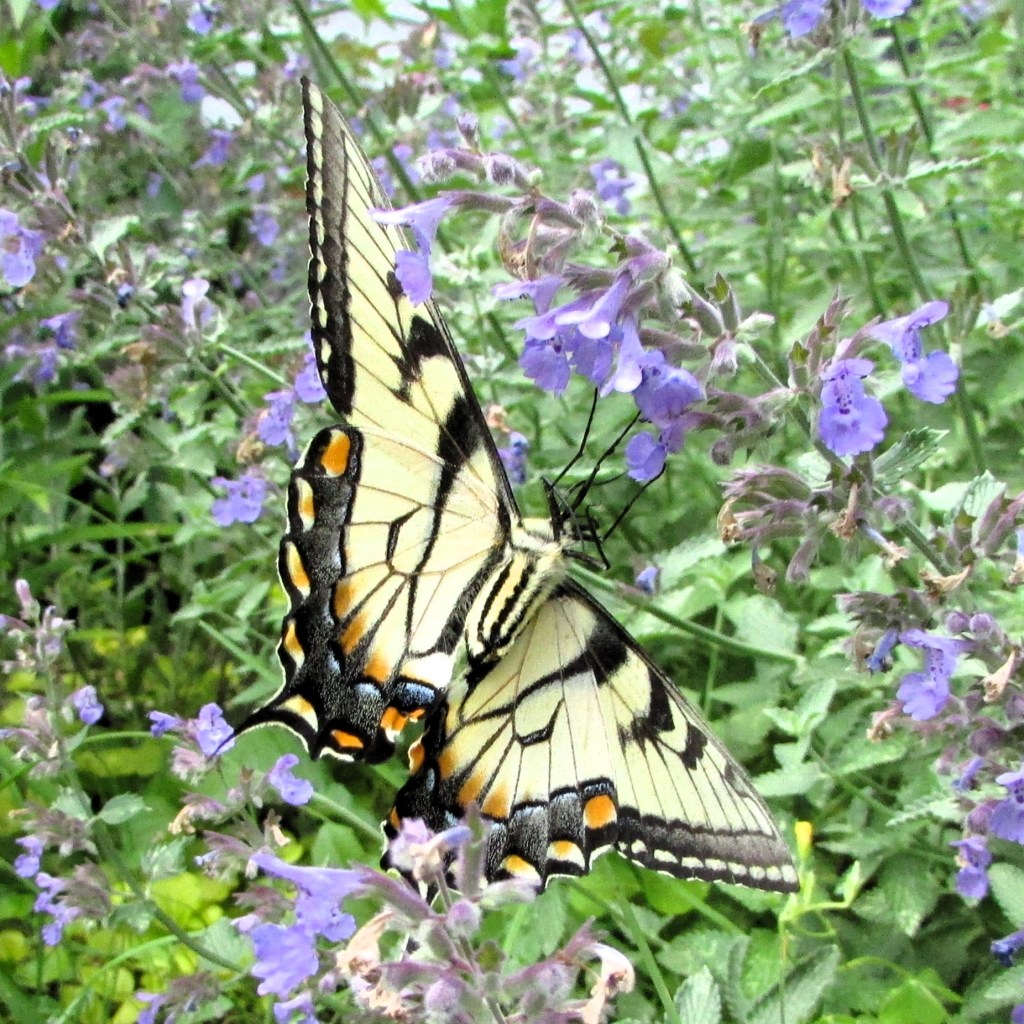 The large butterflies are finally showing up in my backyard. We’ve also seen many Yellow Swallowtails on daytrips as we drive toward the ocean shoreline. I am relieved. They are late, but they are here. Today I saw two Yellow Swallowtails, the largest butterfly in this area, on my butterfly bush at the same time.