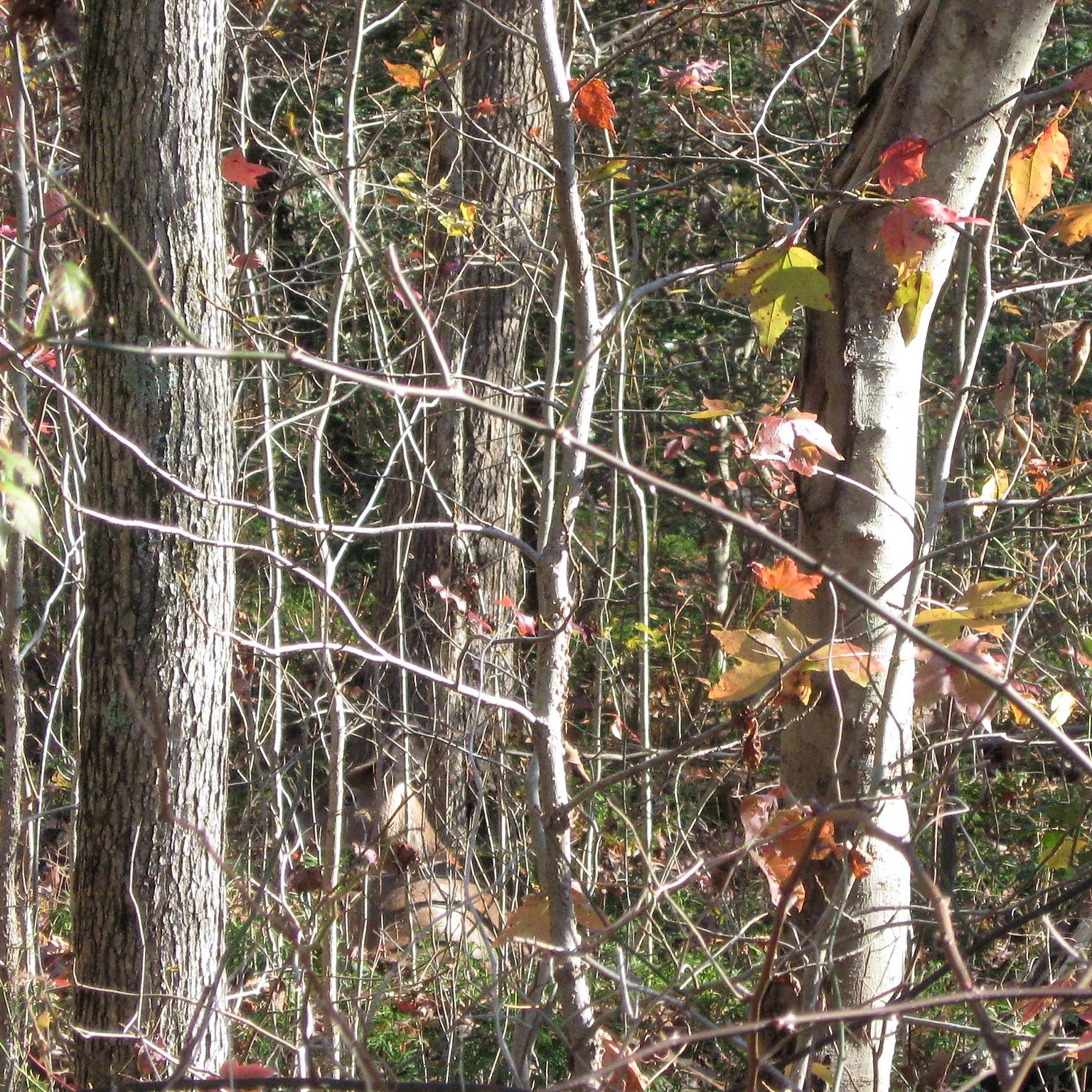 If I had visited when undergrowth was growing wild and lush, I would have missed this sight. “Look, through these trees,” my husband said, pointing the way. I didn’t see much at first, but then saw the gleam of sun on a living creature.