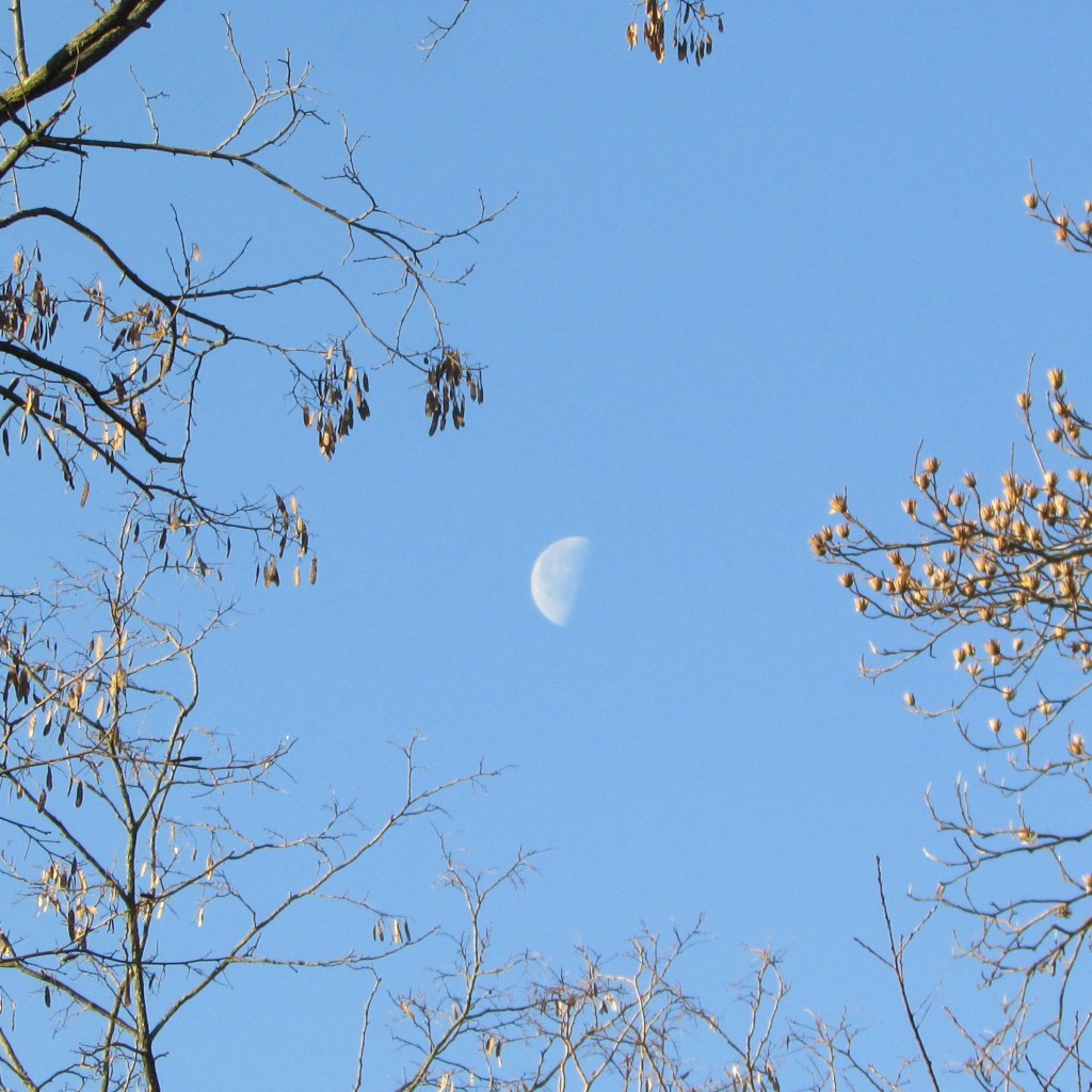 Last Quarter Moon, glowing in the morning sky, framed by woodland trees.
