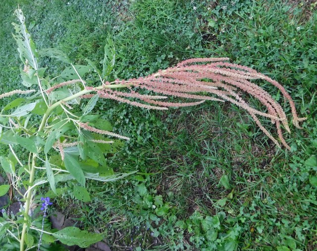 My Love-Lies-Bleeding plants have grown to near four foot tall. During the last torrential rainstorm, the largest fell over and kissed the ground; precautionary staking would have been a good idea. I have mixed feelings about staking ornamental garden plants, an ugly support is an awkward eyesore and inevitably robs the plant of its natural flow of growth. I tend to stake a plant after-the-fact of leaning or falling over.