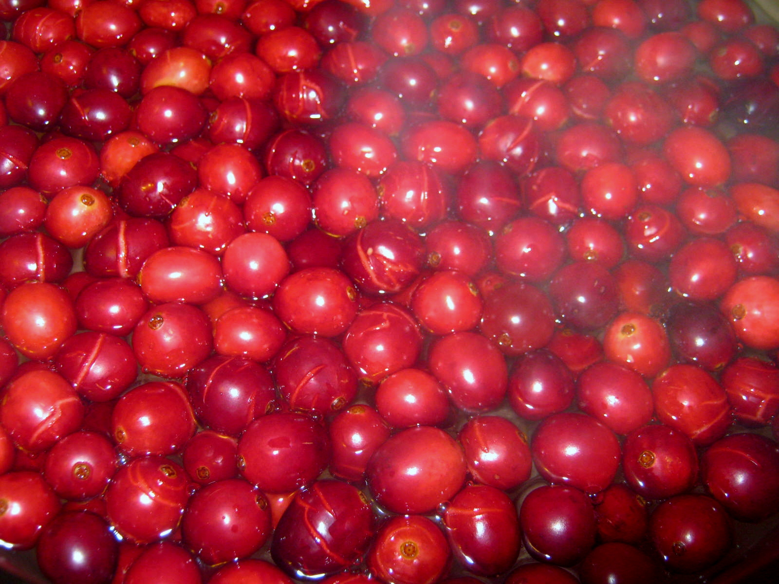 First I sorted through the berries, keeping only those that were firm and dark red in color. I carefully washed them taking care not to bruise them. While I was doing this I boiled about two quarts of water. I placed the clean cranberries in a large bowl and poured the boiling water over them.