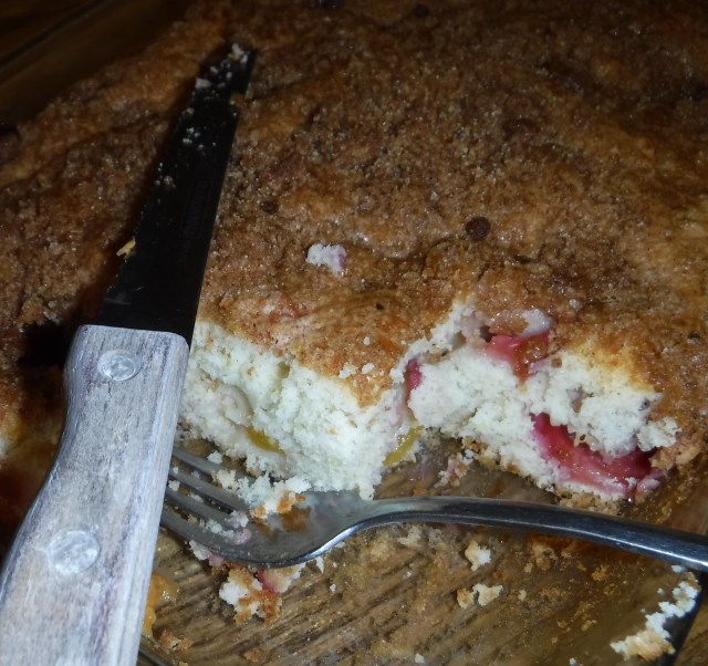 I’ve baked two buckles in one week. I use any overripe, juicy fruits I have on hand. My favorite combination so far has been plums and nectarines. In addition to changing the type of fruit in the recipe, I also used dark brown sugar instead of light, cinnamon in place of nutmeg. Because the recipe is protected under copyright law, I can’t include it in my post, but I can give you the link to the recipe: Food Network.com – Blueberry-Peach Buckle. The recipe is quick and easy. All who sampled the cake pronounced it delicious. It warms easily in the microwave and stores well at room temperature for a day or two. We eat it fast! If I was keeping it any longer I would store it in the refrigerator.