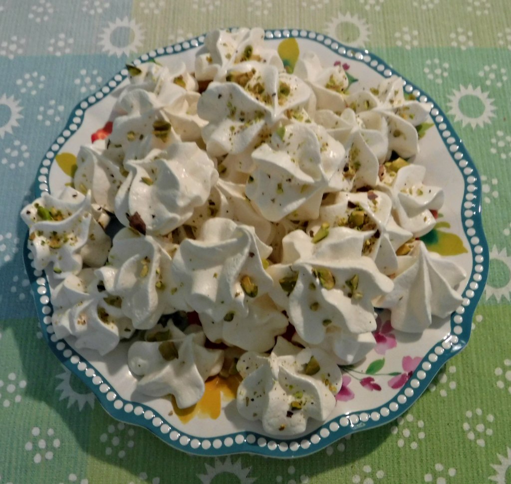 I rarely find meringue cookies in my area, but then, do I really look hard enough? Recently, I came upon Ina Garten’s recipe for Salted Pistachio Meringue cookies and my craving for them would not be denied.