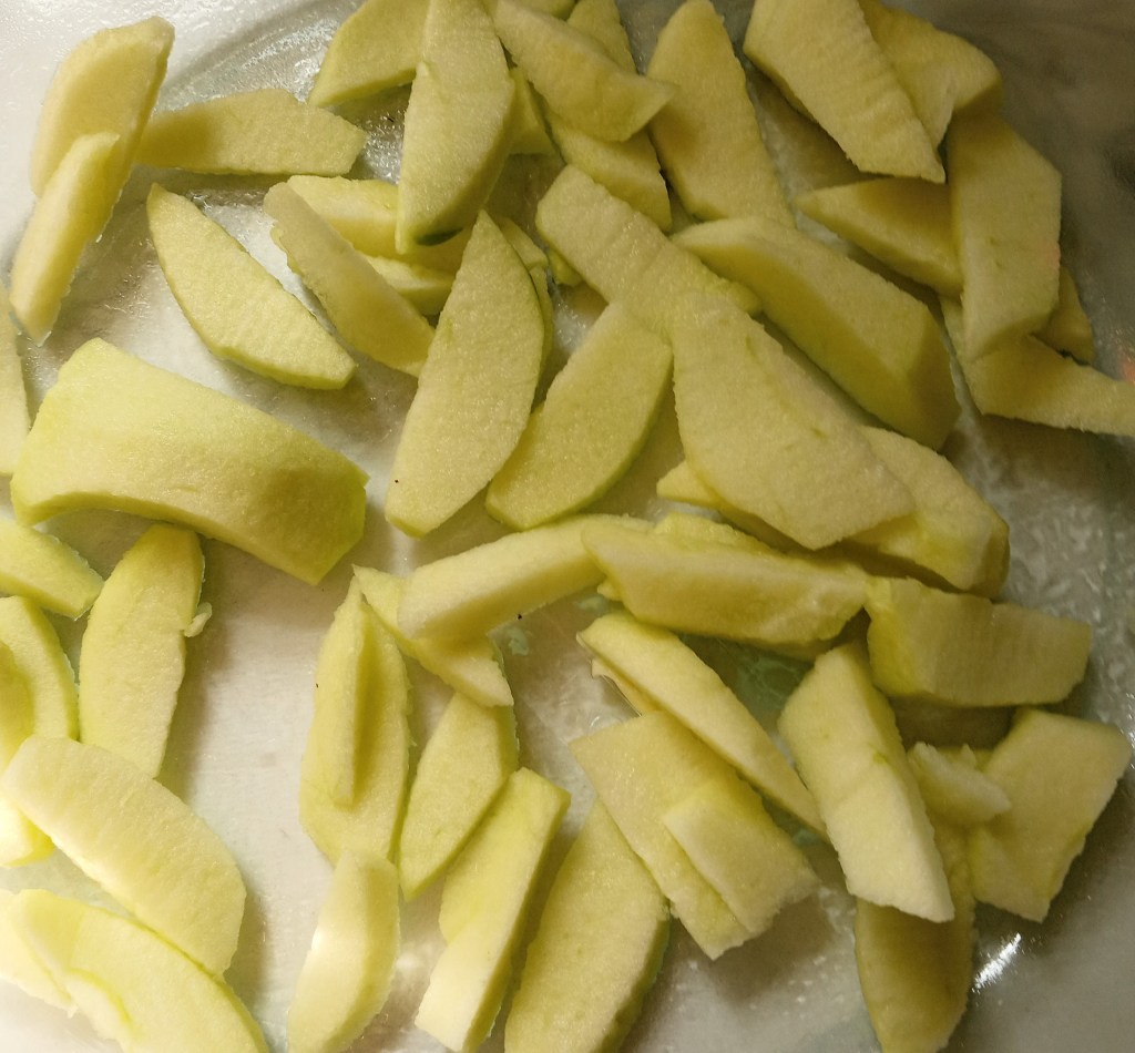 Peel (or if you love eating apple peel, try leaving it on) two apples. If they are on the small side, I sometimes use three. I chose Granny Smith apples. Green apples are firm, slightly sour, and bake up perfectly. Place evenly in a large, greased pie pan. A square pan would work too, but you might need more apples.