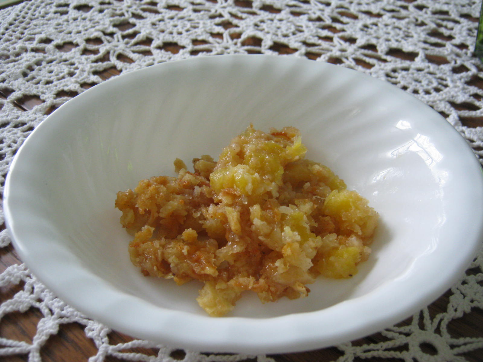 I cut the pineapple up into small chunks as instructed, and began putting the casserole together, only to discover I did not have the proper ingredients. I had no Ritz crackers, and my shredded cheese was flavored for Tacos. RATS! What to do with all the pineapple I had cut? I decided to use what I had on hand. Soda crackers and the Taco flavored cheese would have to stand in for the proper ingredients. I also chose to add a bit of brown sugar to the recipe to mimic the richness of the Ritz Crackers.