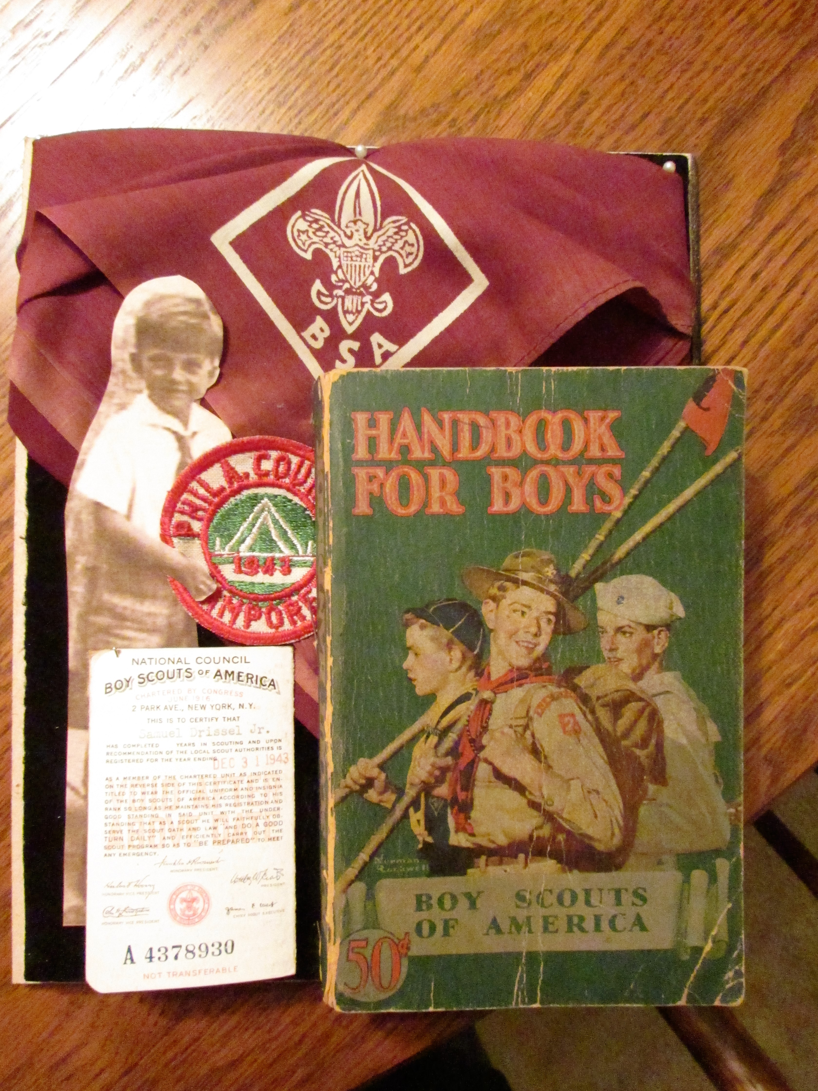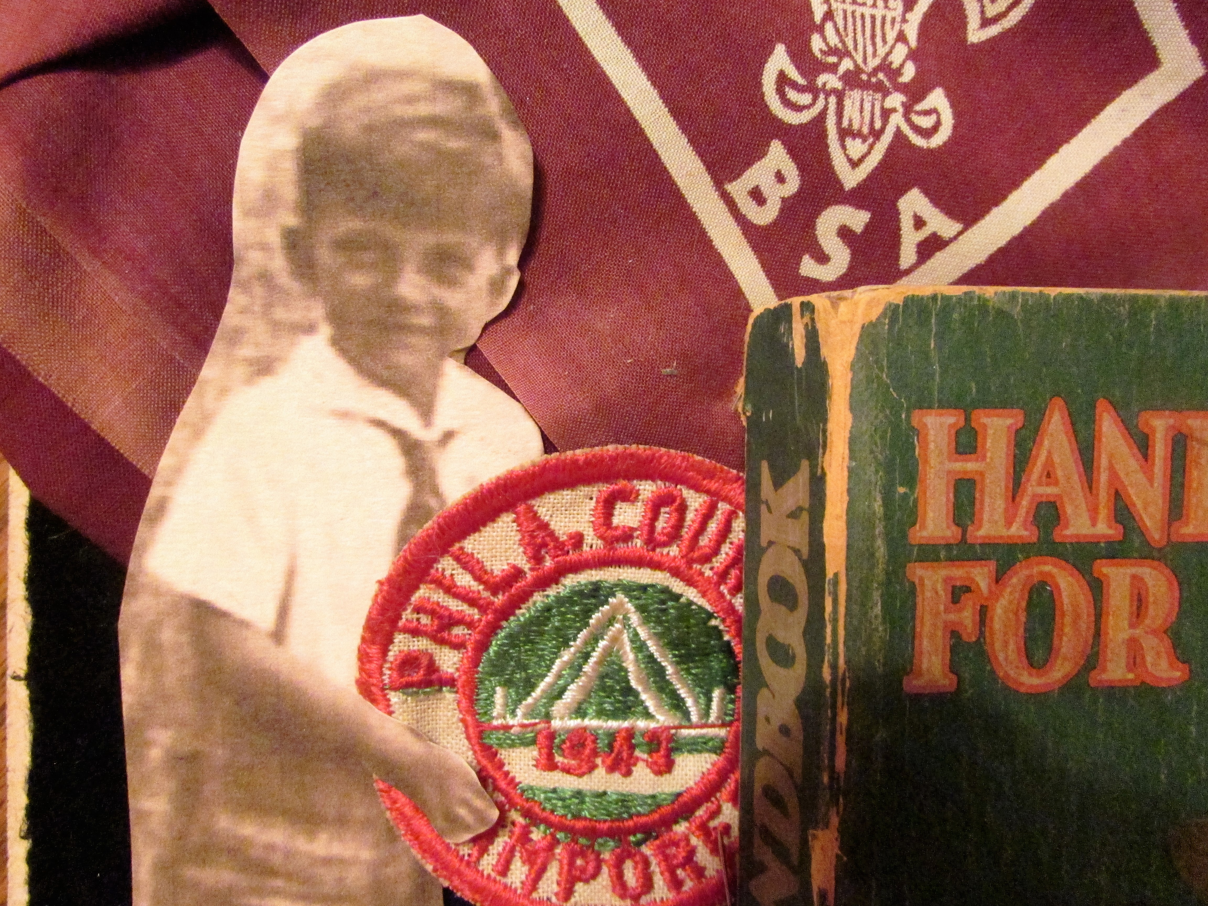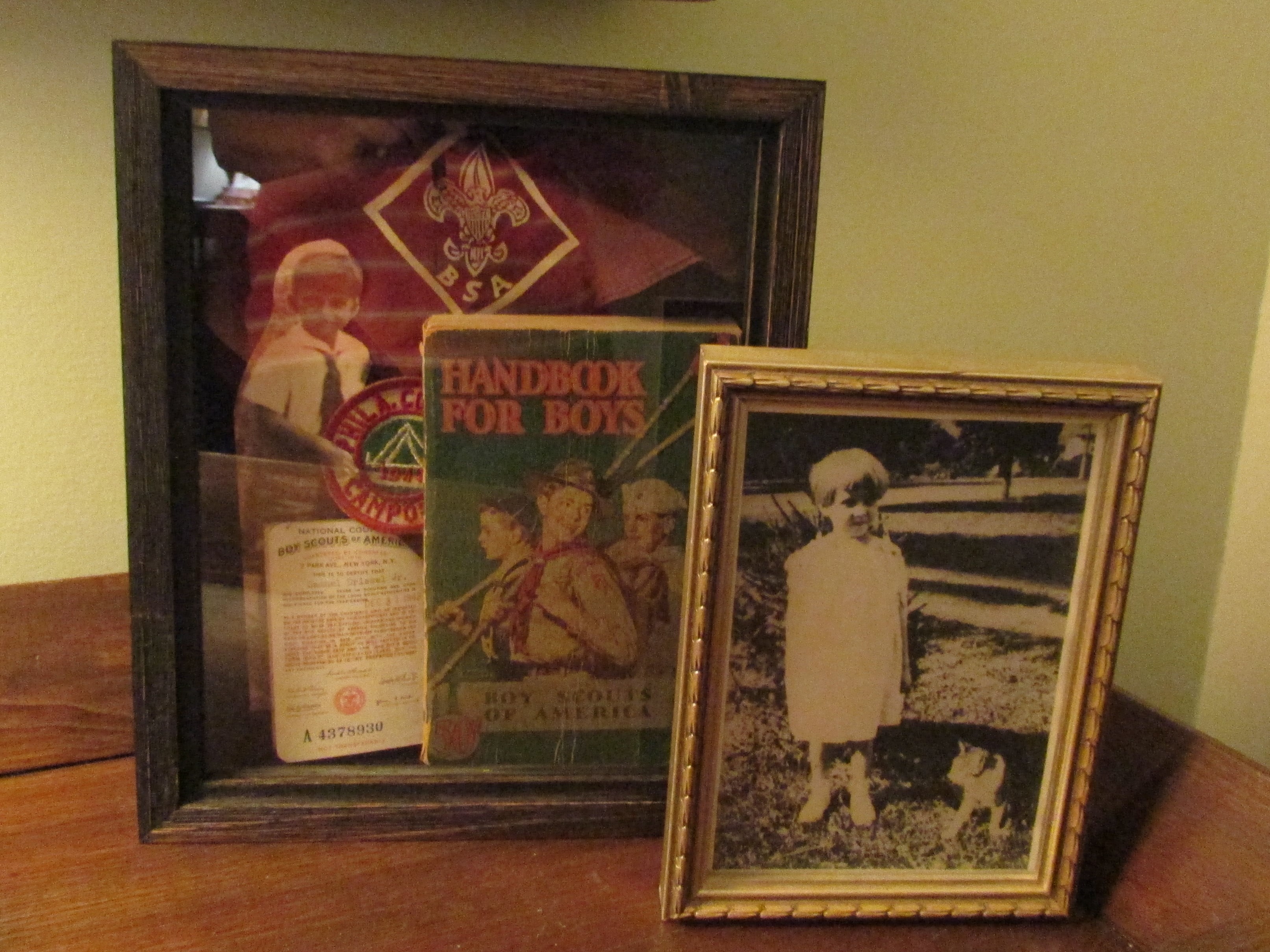 I recently put together a shadowbox of Boy Scout memories with books, scarves, patches and a National Council card dated 1943. These items belonged to my father-in-law and husband, and together they created a perfect assortment of memories to be treasured in a shadowbox.