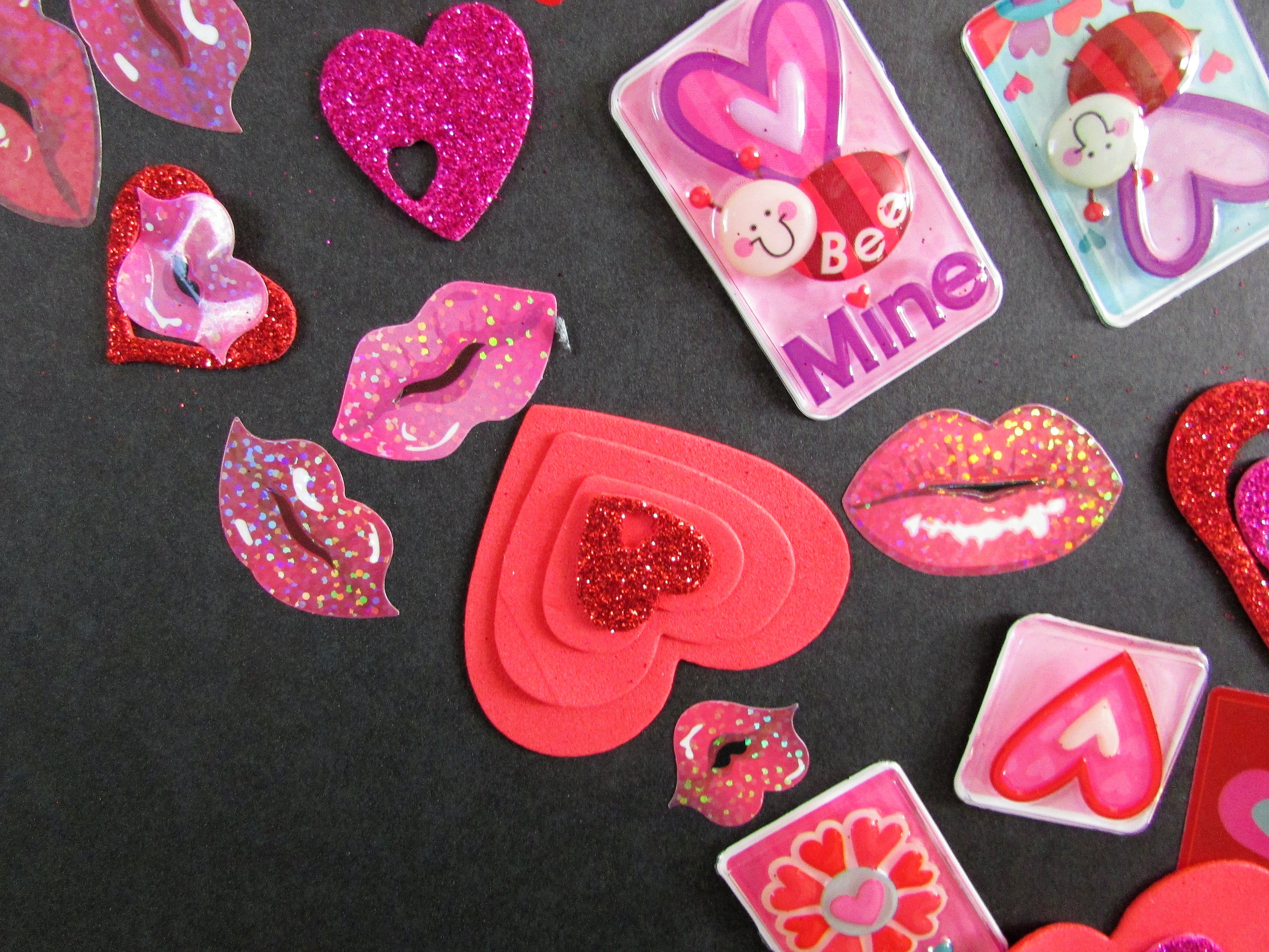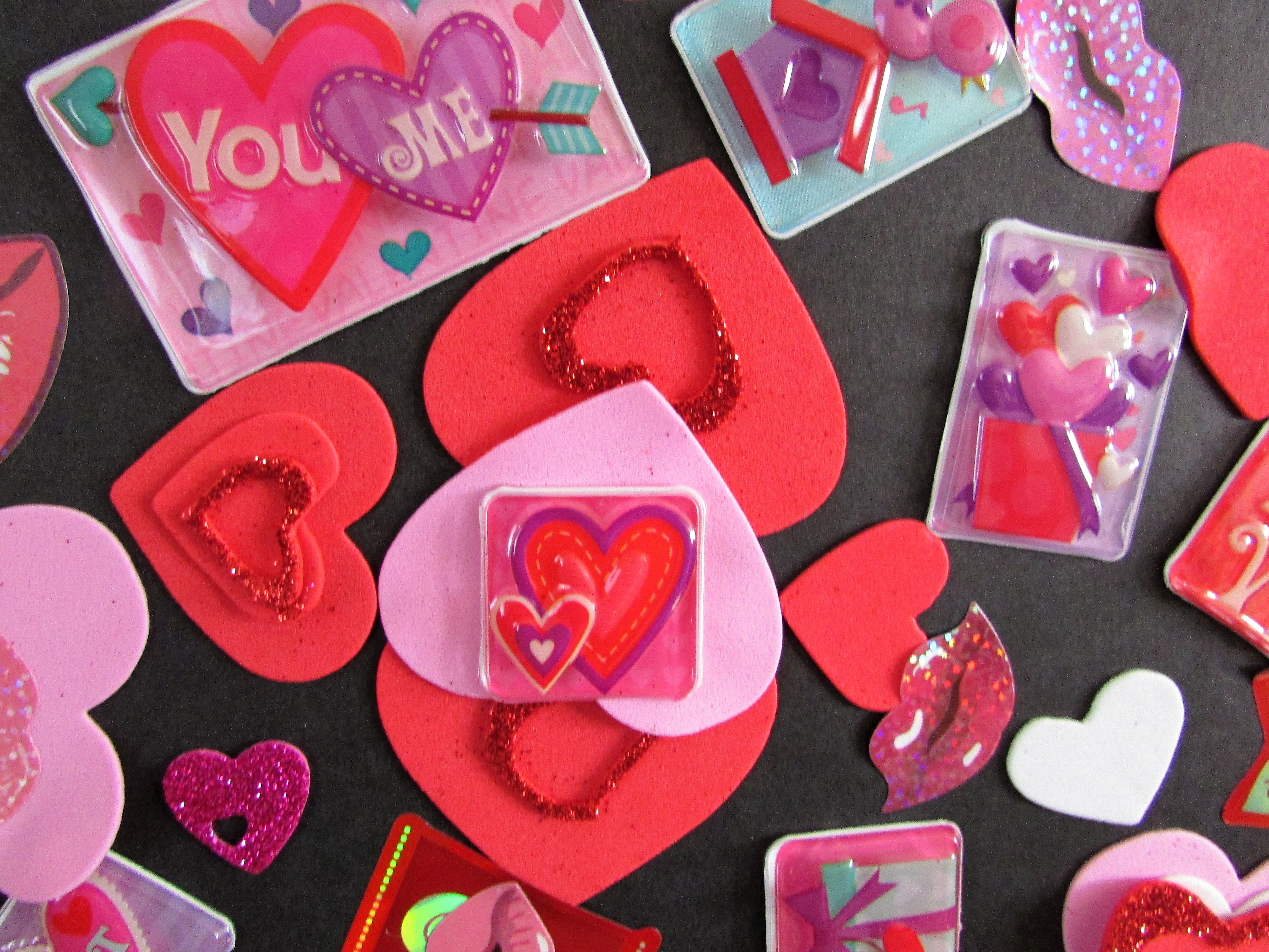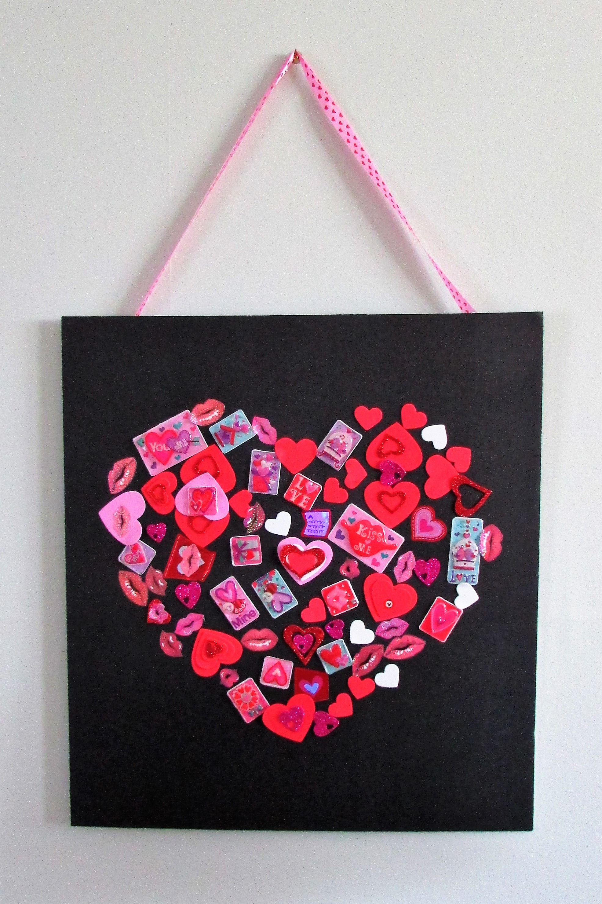 Valentine posters are an inexpensive, quick and easy craft for children. All the elements in the poster were purchased at the dollar store: foam board, stickers and ribbon. An adult version could easily be created using old jewelry, beads, glass pebbles, etc.