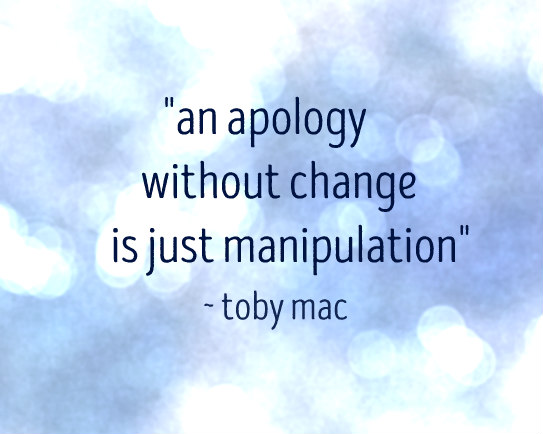 I’ve read some good truths in blogs this week. Scarlett posted the Toby Mac quote below on her blog, Scarlett79, and its wisdom really struck me. I don’t want false apologies without changed behavior from others, neither do I want to be guilty of apologizing without attempting to change.