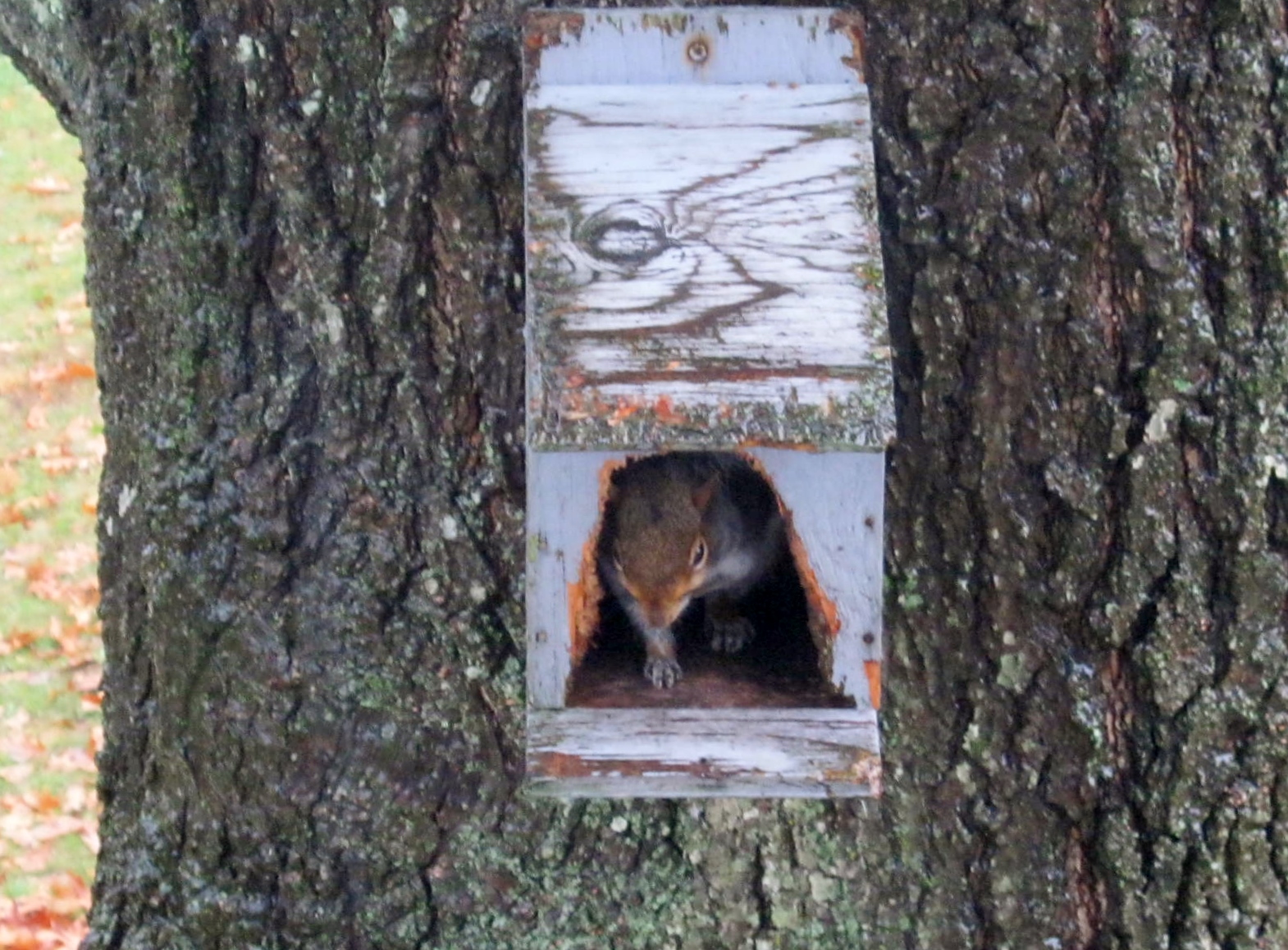 It’s growing colder here in the Mid-Atlantic states. We’ve had several weeks of very brisk and breezy weather. The northern portion of our area has already received a good amount of snow. The little squirrel who lives in our oak tree has already had enough of the early winter. He left his cozy nest of leaves one day to escape the pelting rain. An old bird house, remodeled by the incisors of several generations of squirrels, was the perfect shelter in the wintry rainstorm.