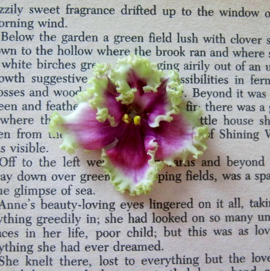 African Violets can often be found for a dollar or two, but a year or so ago I spotted a sample of this beautiful violet at the Philadelphia Flower Show and just had to have it. I don’t know if it was the frilly edge of green circling each petal, or maybe the name “Mystic Mermaid,” but my heart pitter-pattered and I reached for my wallet at the African Violet plant stand. The violet I purchased was double, perhaps triple the price of a grocery store violet, and consisted of half a dozen leaves, but I took the speedline home with daydreams of the plant blooming in my home. It has taken quite awhile for my violet to fulfill my dreams, but it has been worth the wait.
