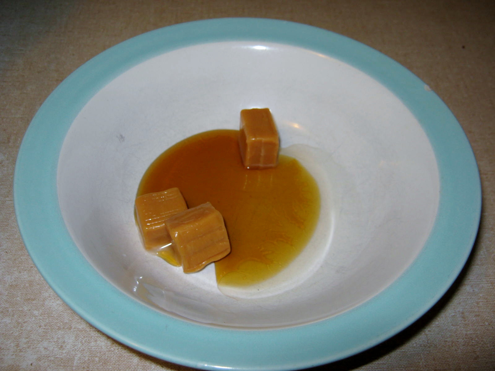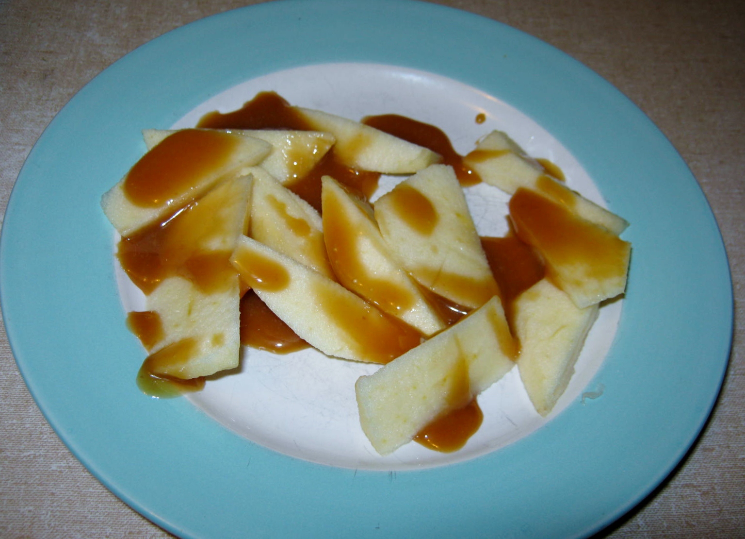 Unwrap three caramels. Place in a microwave-safe bowl. Add 1 tablespoon of dark corn syrup and 1 teaspoon of water. Microwave for twenty seconds. Stir with a fork. Microwave for twenty seconds more. Stir until all the ingredients are combined and form a syrup. Pour over the apple slices and enjoy. Ahhhhhh….Scrumptious! And so very EASY.
