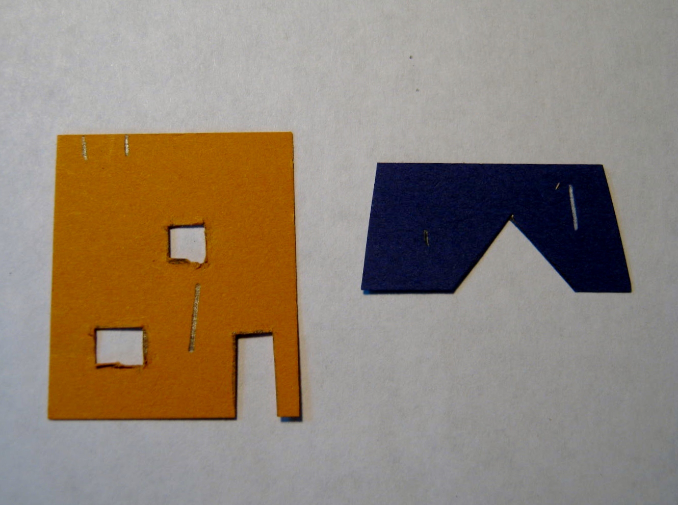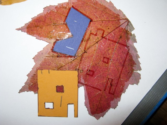 When the Mod-Podge is completely dry, I use a Sharpie marker to trace the house pattern onto the mod-podged side of the leaves. Use a marker that is as close to the color of the leaf as possible or it might show through to the front side. Make sure you remember that when you cut out the traced pattern it will reverse itself. For instance, in the finished card, if I use side one of my pattern to trace, on the finished house the door will be on the left of the house, not on the right.