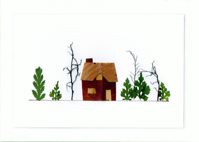 Brush the Mod Podge on the back of the leaves with a soft brush. Let it dry completely. While it dries create a pattern out of cardboard for the shape you want to use. In my case it was a tiny house greeting card I call “Home Sweet Home.”
