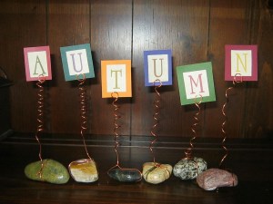 The hydrangeas are in a vase that, while a bit minty, can almost pass for sage green. I frequently use this McCoy Swan vase for arrangements. Surrounding the vase are gourds we bought in farm markets and garden centers this past weekend. A wise owl looks on the display; his heart-shaped face expresses fond approval of my choices. A wooden mushroom, last year’s birthday present from a sister, seems to fit in with the theme. I love to strew beads and garlands of bells over the mantel in a haphazard way. It adds a bit of interest.