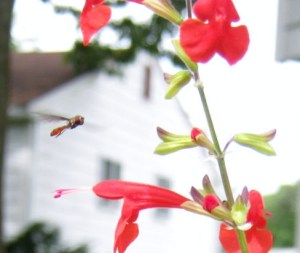 Last but not least is my Lady In Red Salvia, a great hummingbird flower. I love the little hover-fly sipping nectar that I captured in the photograph below.