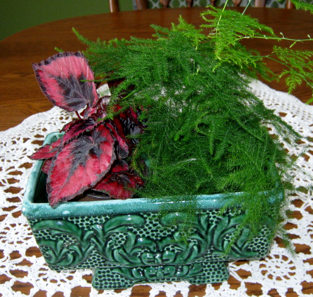 The begonia and asparagus fern placed in an antique planter make a beautiful centerpiece on my dining room table. Combined, they cost about the same as a bouquet of cut flowers. They will last much longer, and in the long-run be more economical than buying fresh flowers weekly. Well, it sounds like good logic anyway! 🙂