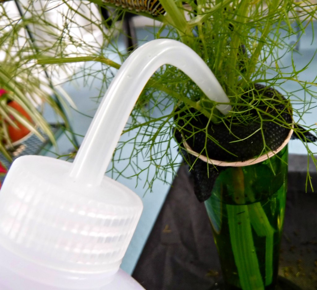 Before I gather the caterpillars, I always have vases of water ready to hold the host plant of fennel. Most importantly, I cover the top of the vase with some sort of barrier to keep the small cats from drowning, Unfortunately, I know from experience, they often wander into the water if the opening is left uncovered. I use garden cloth and a single rubber band. A small hole snipped in the center allows me to insert the fennel. At the start of their feeding, one frond of fennel will be enough. They will soon need several stems a day as they progress through their instars: a period of time between the caterpillar molting.