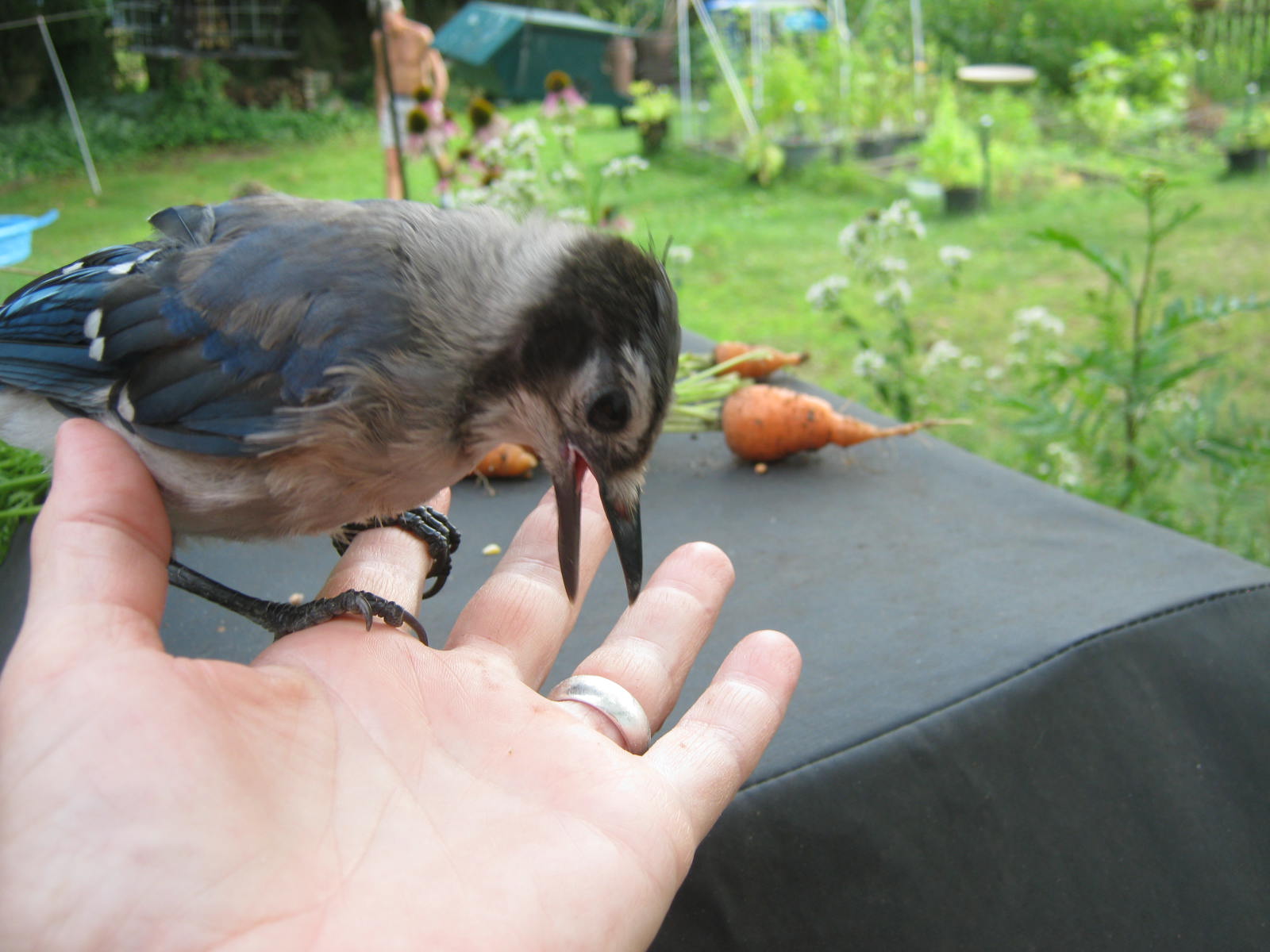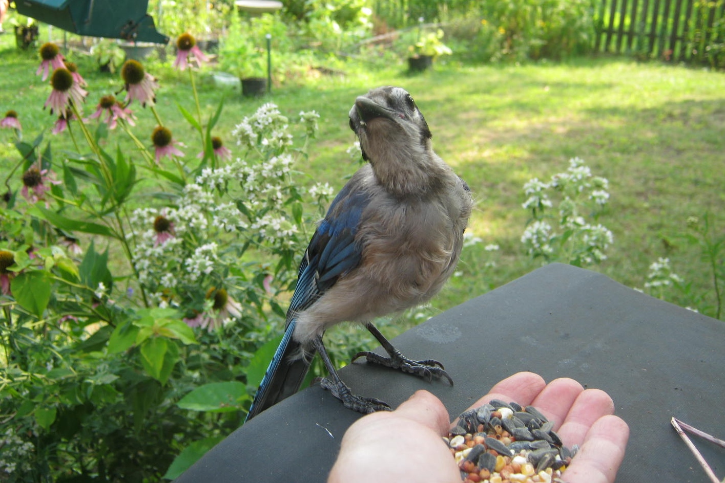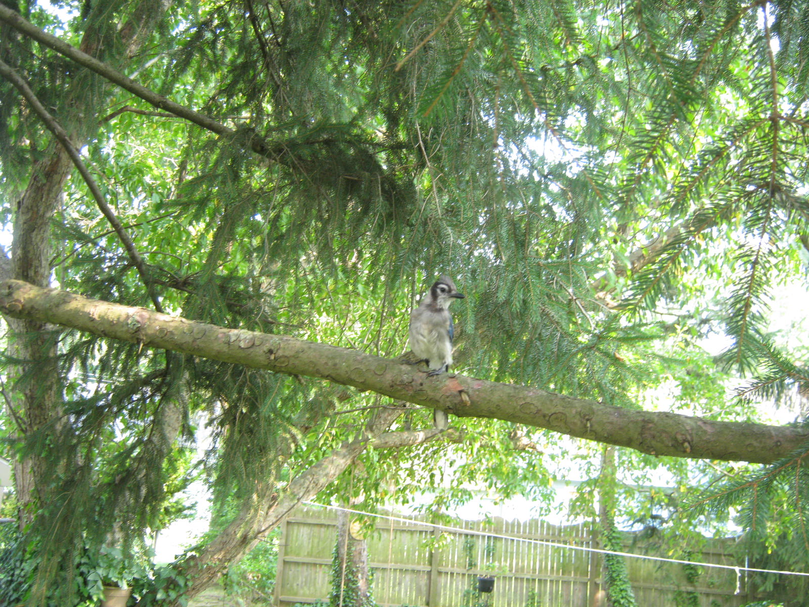 My quick plummet of mood immediately lifted when I looked up. The sky was brilliant blue. Leaves in the distance were crowned with a golden luster, and I am sure by week’s end most trees will be producing a bit more color. I spotted a blue jay among the greens and golds and was able to capture him with my zoom lens.