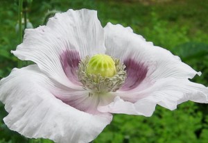 Here is a picture of me standing alongside one of my Square Foot Gardens admiring my Bread Seed Poppies. I stand about 5’4″ tall. The poppies are a bit hard to see, they are white and blending into the background. Here is a closer look.