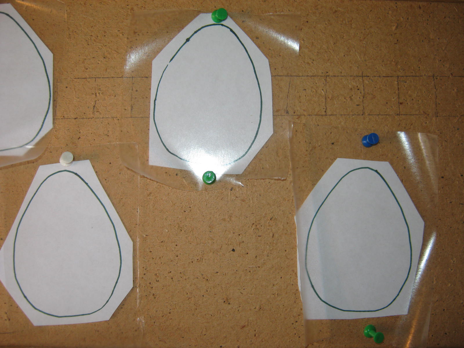 I removed the backing from the Coverseal and placed it, tacky side up over the computer paper outline. I placed each of these onto a cork bulletin board and tacked the outer edges down with push pins to hold it steady.