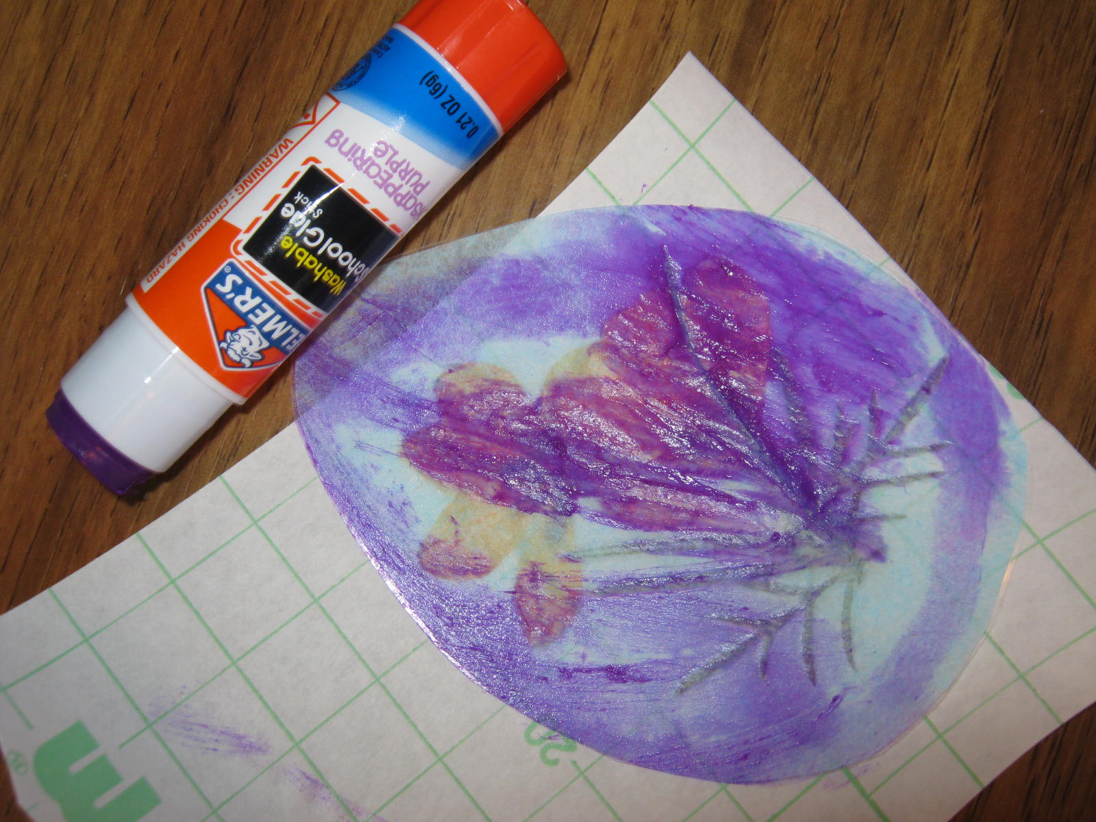 Turn the egg over and cover most of it, especially the edges, with glue stick. I use a glue stick that goes on purple and turns clear. The purple makes it very easy to make sure you have all the edges covered. Place egg on waiting greeting card and let dry. Voila`…a beautiful handcrafted Easter greeting card.