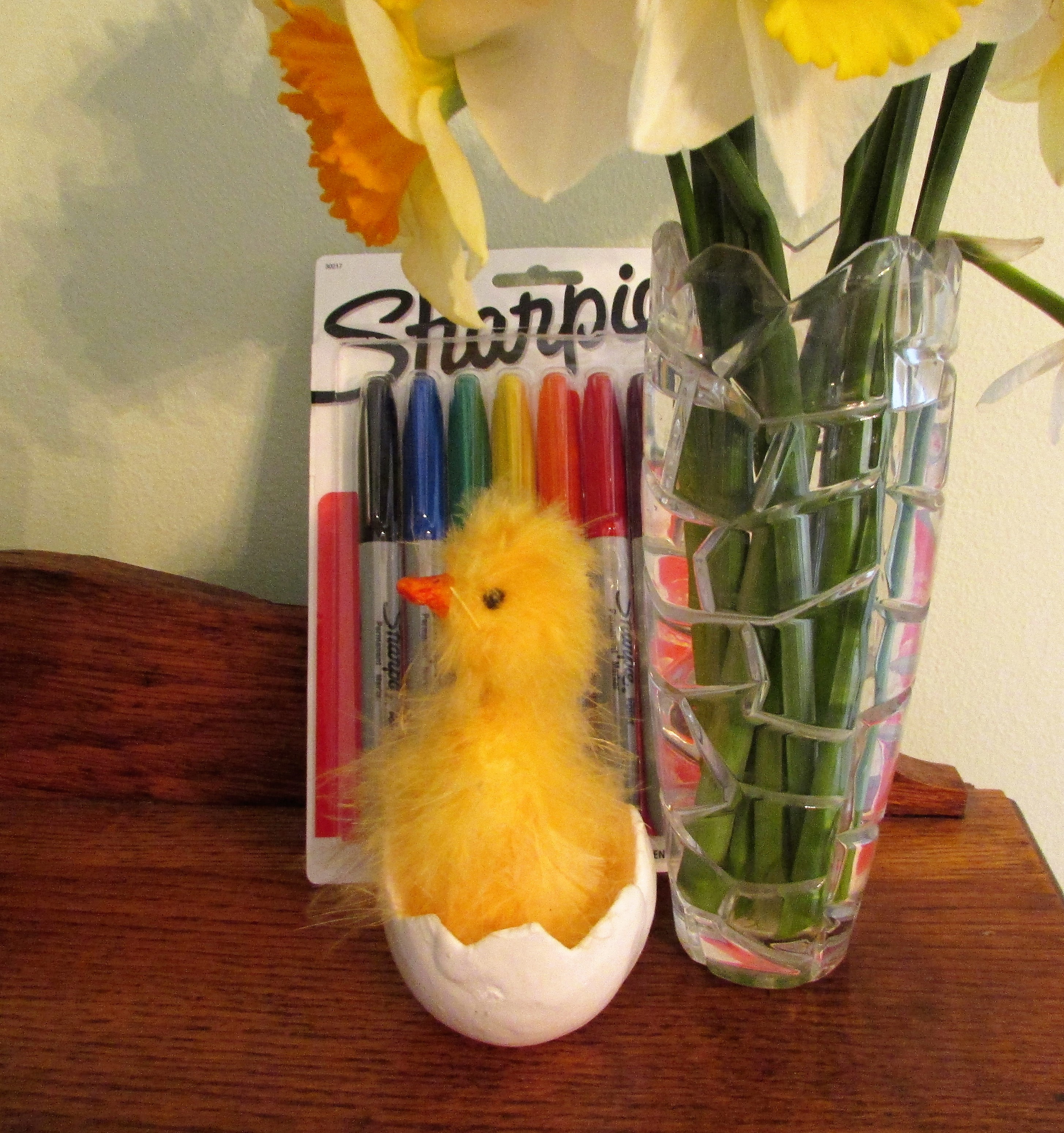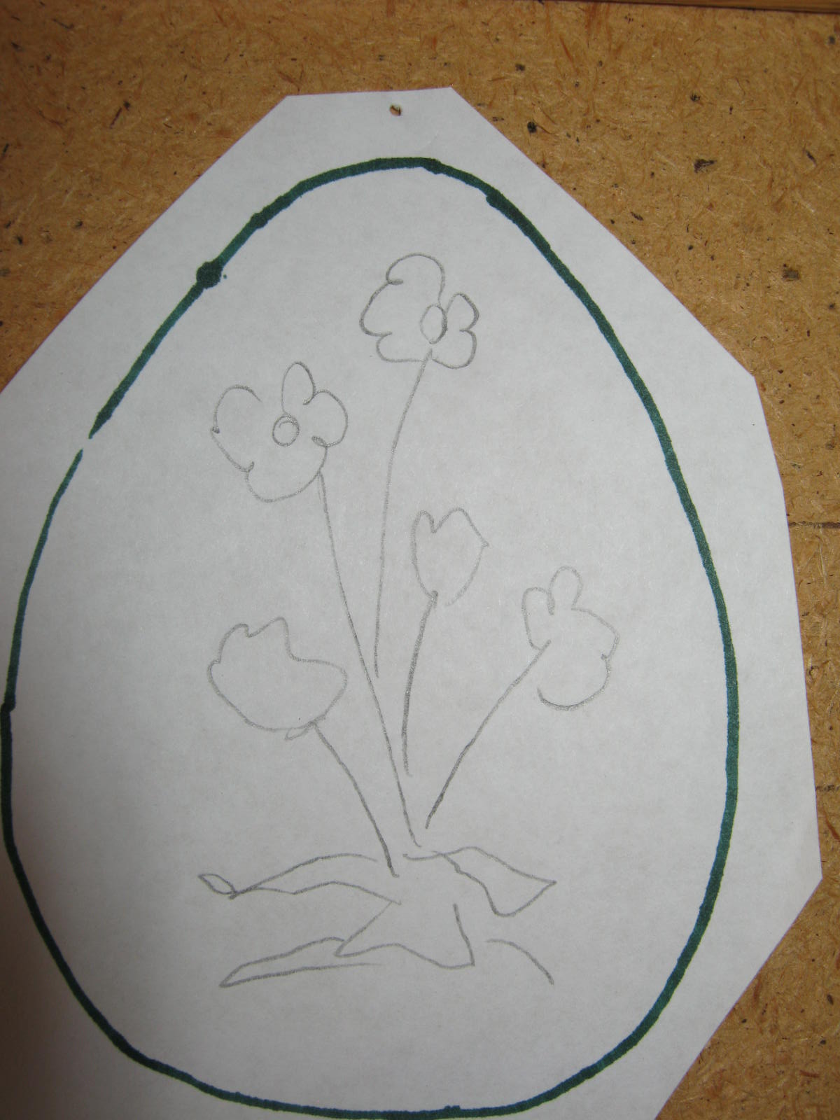 To begin, I found an egg-shape on the web in Google Images and traced it with tracing paper. An egg-shape seems easy to draw free-hand until you attempt to have both sides perfectly even…not easy! After I found and traced an egg-shape, I cut it out and then traced the shape onto cardboard. I traced the shape onto a piece of Coverseal, a very clear type of contact paper, made four outlines on plain white computer paper, and then traced yet again onto robin’s egg blue tissue paper. I cut the tissue paper eggs out around the outline.