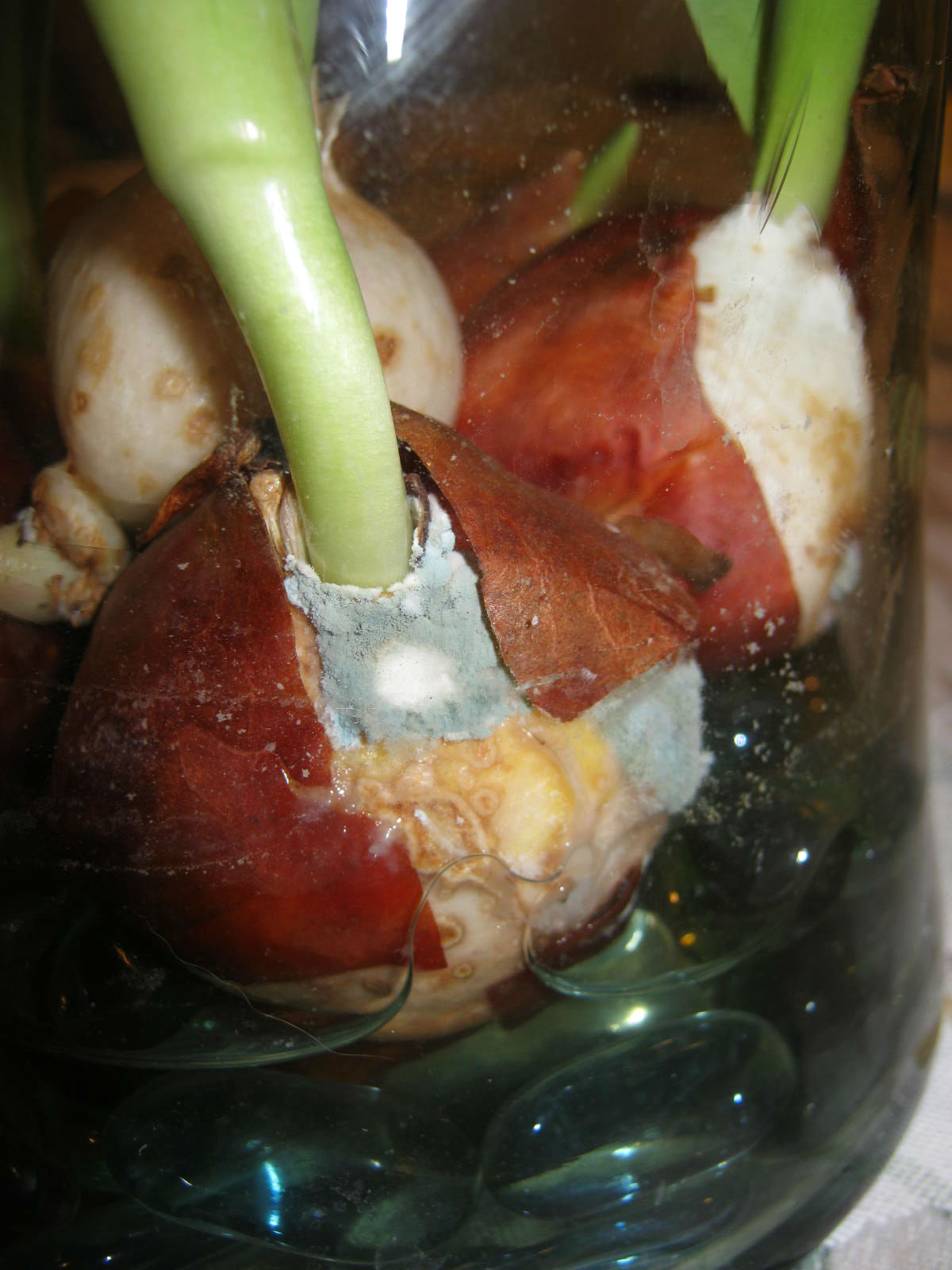 Every time I have forced bulbs, they have developed a bit of bluish-grey mold. The bulb company calls this mold transportation mold. To remove this, I dip a paintbrush in rubbing alcohol and swipe it over the ugly fluff. Hydrogen peroxide works as well. After I treat the mold, I change out the water.
